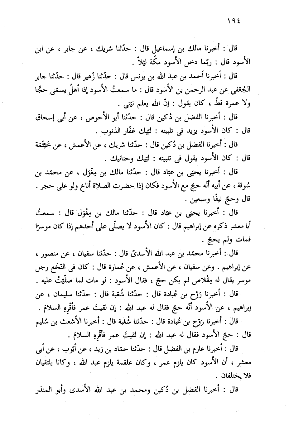 قال: أخبرنا أحمد بن عبد الله بن يونس قال: حدّثنا زُهير قال: حدّثنا جابر الجُعْفي عن عبد الرحمن بن الأسود قال: ما سمعتُ الأسود إذا أهلّ يسمّى حجًّا ولا عمرة قطّ، كان يقول: إنّ الله يعلم نيَتى.