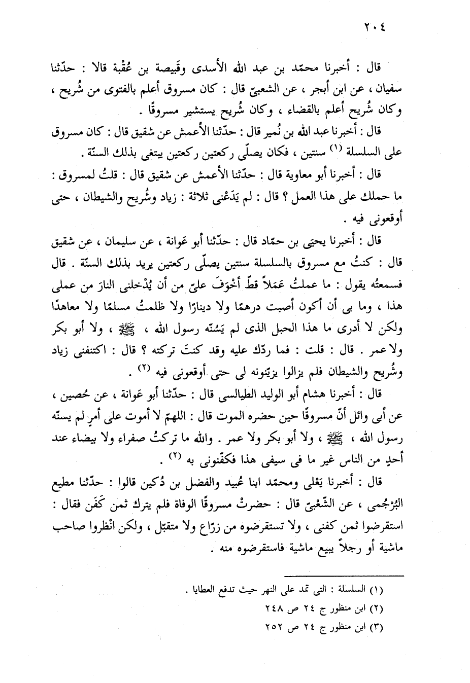 قال: أخبرنا يحيَى بن حمّاد قال: حدّثنا أبو عَوانة، عن سليمان، عن شقيق قال: كنتُ مع مسروق بالسلسلة سنتين يصلّى ركعتين يريد بذلك السنّة. قال فسمعتُه يقول: ما عملتُ عَمَلًا قطّ أخْوَفَ علىّ من أن يُدْخلنى النارَ من عملى هذا، وما لى أن أكون أصبت درهمًا ولا دينارًا ولا ظلمتُ مسلمًا ولا معاهدًا ولكن لا أدرى ما هذا الحبل الذي لم يَسُنّه رسول الله، -صلى الله عليه وسلم-، ولا أبو بكر ولا عمر. قال: قلت: فما ردّك عليه وقد كنتَ تركته؟ قال: اكتنفنى زياد وشُريح والشيطان فلم يزالوا يزيّنونه لى حتى أوقعونى فيه (¬٢).