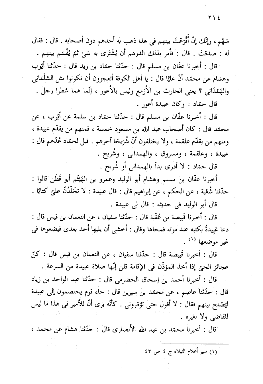 أخبرنا عفّان بن مسلم وهشام أبو الوليد وعمرو بن الهَيْثَم أبو قَطَن قالوا: حدّثنا شُعْبة، عن الحكم، عن إبراهيم قال: قال عبيدة: لا تخَلّدُنّ علىّ كتابًا.
