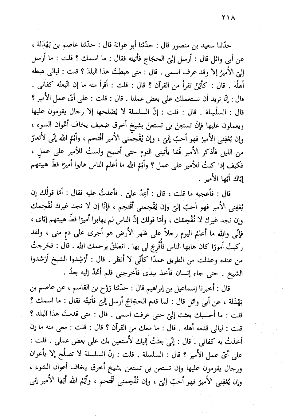 حدّثنا سعيد بن منصور قال: حدّثنا أبو عوانة قال: حدّثنا عاصم بن بَهْدَلة، عن أبي وائل قال: أرسل إليّ الحجّاج فأتيته فقال: ما اسمك؟ قلت: ما أرسل إليّ الأميرُ إلا وقد عرف اسمى. قال: متى هبطتَ هذا البلدَ؟ قلت: ليالى هبطه أهلُه. قال: كأيّنْ تقرأ من القرآن؟ قال: قلت: أقرأ منه ما إن اتّبعتُه كفانى. قال: إنّا نريد أن نستعملك على بعض عملنا. قال: قلت: على أيّ عمل الأمير؟ قال: السلْسِلة. قال: قلت: إنّ السلسلة لا يُصْلحها إلا رجال يقومون عليها ويعملون عليها فإنْ تستعِنْ بى تستعنْ بشيخٍ أخرق ضعيف يخاف أعْوان السوء، وإن يُعْفِنى الأميرُ فهو أحبّ إليّ، وإن يُقْحمنى الأمير أقْتحم، وايْمُ الله إنّى لأتعارّ من الليل فأذكر الأمير فَمَا يأتينى النوم حتى أصبح ولستُ للأمير على عملٍ، فكيف إذا كنتُ للأمير على عمل؟ وايْمُ الله ما أعلم الناس هابوا أميرًا قطّ هيبتهم إيّاك أيّها الأمير.