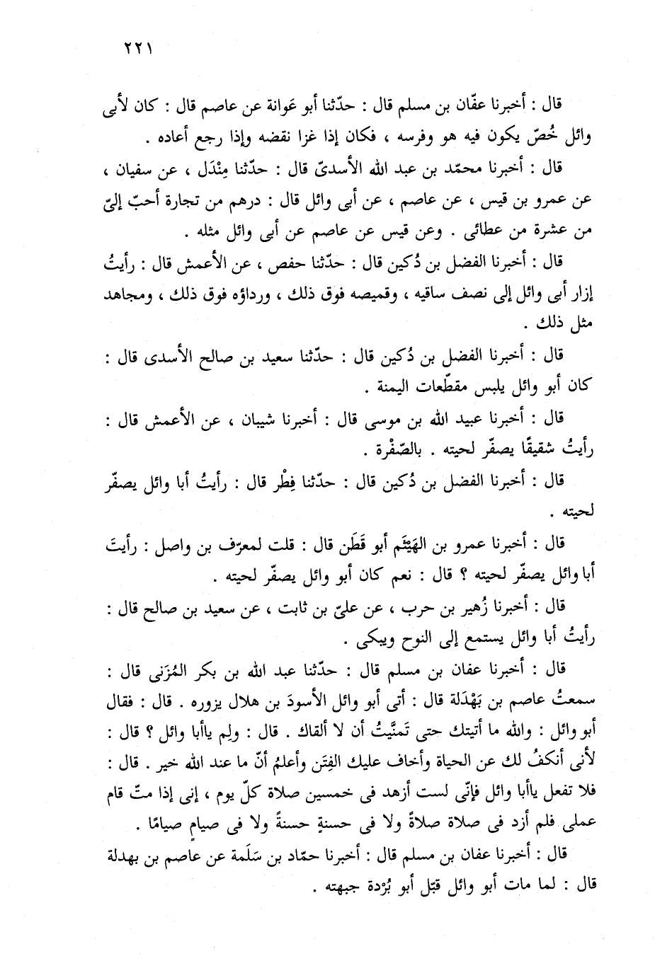 قال: أخبرنا عفان بن مسلم قال: حدّثنا عبد الله بن بكر المُزَنى قال: سمعتُ عاصم بن بَهْدَلة قال: أتى أبو وائل الأسودَ بن هلال يزوره. قال: فقال أبو وائل: والله ما أتيتك حتى تَمنَّيتُ أن لا ألقاك. قال: ولِم يا أبا وائل؟ قال: لأنى أنكفُ لك عن الحياة وأخاف عليك الفِتَن وأعلمُ أنّ ما عند الله خير. قال: فلا تفعل يا أبا وائل فإنّى لست أزهد في خمسين صلاة كلّ يوم، إنى إذا متّ قام عملى فلم أزد في صلاة صلاةً ولا في حسنةٍ حسنةً ولا في صيامٍ صيامًا.