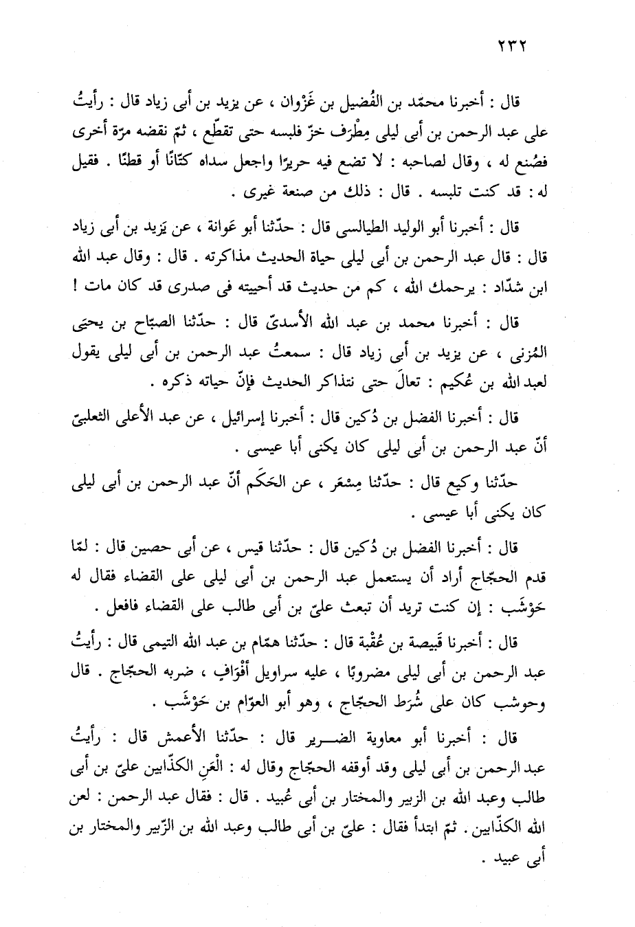 قال: أخبرنا أبو معاوية الضرير قال: حدّثنا الأعمش قال: رأيتُ عبد الرحمن بن أبي ليلى وقد أوقفه الحجّاج وقال له: الْعَنِ الكذّابين عليّ بن أبي طالب وعبد الله بن الزبير والمختار بن أبي عُبيد. قال: فقال عبد الرحمن: لعن الله الكذّابين. ثمّ ابتدأ فقال: عليّ بن أبي طالب وعبد الله بن الزّبير والمختار بن أبي عبيد.