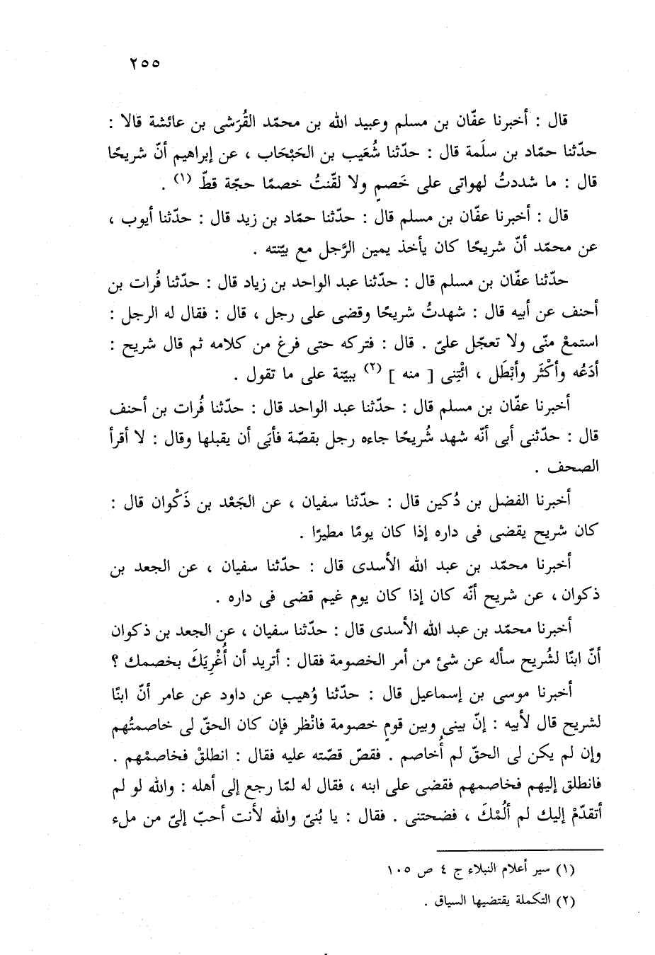 قال: أخبرنا عفّان بن مسلم وعبيد الله بن محمّد القُرَشى بن عائشة قالا: حدّثنا حمّاد بن سلَمة قال: حدّثنا شُعَيب بن الحَبْحَاب، عن إبراهيم أنّ شريحًا قال: ما شددتُ لهواتى على خَصمٍ ولا لقّنتُ خصمًا حجّة قطّ (¬١).