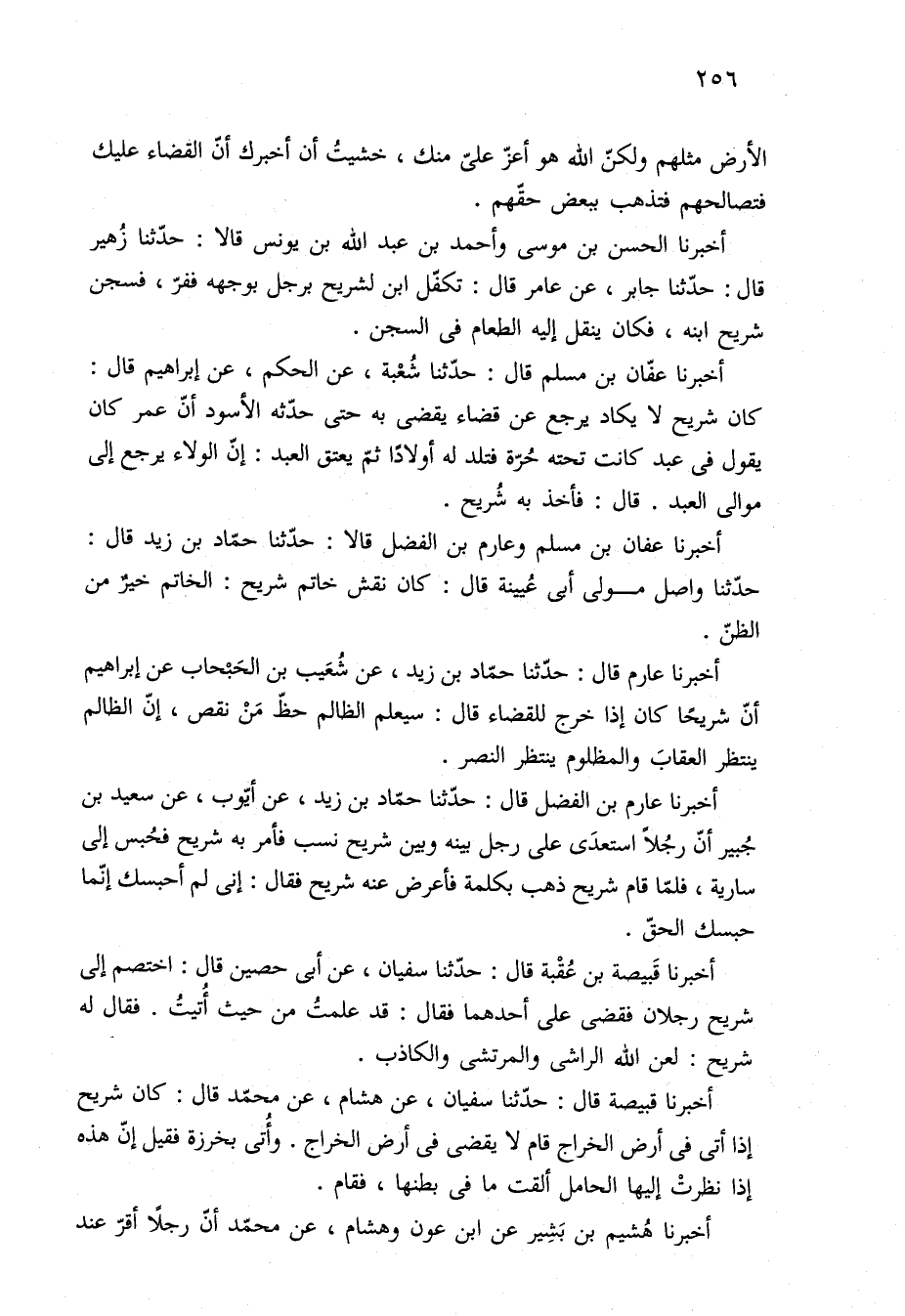 أخبرنا عارم بن الفضل قال: حدّثنا حمّاد بن زيد، عن أيّوب، عن سعيد بن جُبير أنّ رجُلًا استعدَى على رجل بينه ويين شريح نسب فأمر به شريح فحُبس إلى سارية، فلمّا قام شريح ذهب بكلمة فأعرض عنه شريح فقال: إنى لم أحبسك إنّما حبسك الحقّ.