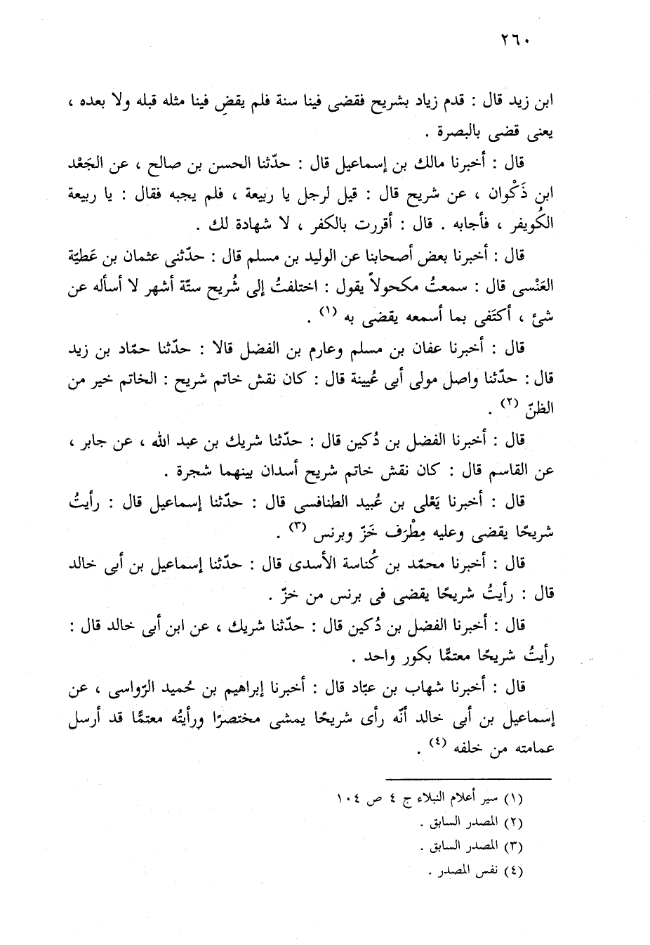 قال: أخبرنا شهاب بن عبّاد قال: أخبرنا إبراهيم بن حُميد الرّواسي، عن إسماعيل بن أبي خالد أنّه رأى شريحًا يمشى مختصرًا ورأيتُه معتمًّا قد أرسل عمامته من خلفه (¬٤).