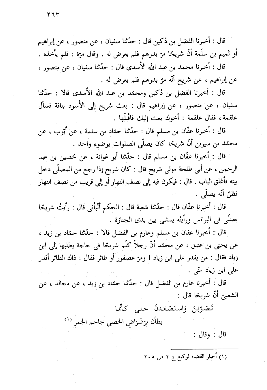 قال: أخبرنا عفّان بن مسلم قال: حدّثنا أبو عَوانة، عن حُصين بن عبد الرحمن، عن أبي طلحة مولى شريح قال: كان شريح إذا رجع من المصلّى دخل بيته فأغلق الباب. قال: فيكون فيه إلى نصف النهار أو إلى قريب من نصف النهار فظنّ أنّه يصلّى.