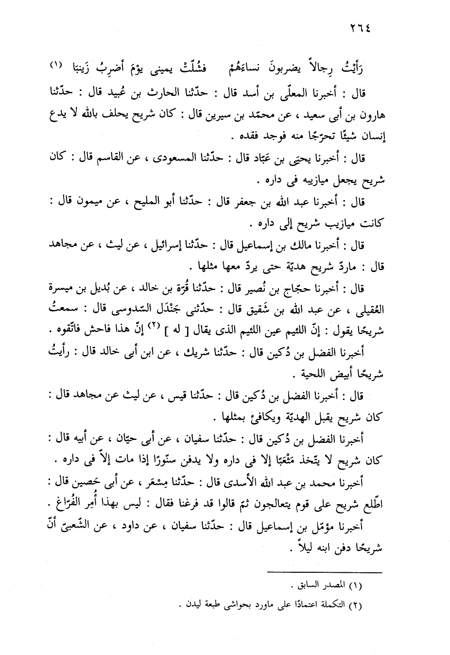 قال: أخبرنا المعلّى بن أسد قال: حدّثنا الحارث بن عُبيد قال: حدّثنا هارون بن أبي سعيد، عن محمّد بن سيرين قال: كان شريح يحلف بالله لا يدع إنسان شيئًا تحرّجًا منه فوجد فقده.
