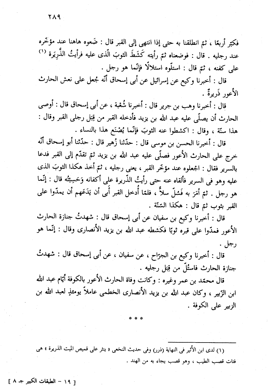 قال: أخبرنا الحسن بن موسى قال: حدّثنا زُهير قال: حدّثنا أبو إسحاق أنّه خرج على الحارث الأعور فصلّى عليه عبد الله بن يزيد ثمّ تقدّم إلى القبر فدعا بالسرير فقال: اجْعلوه عند مؤخّر القبر، يعنى رجليه، ثمّ أخذ هكذا الثوبَ الذي عليه وهو في السرير فألقاه عنه حتى رأيتُ الذّريرة على أكفانه وَحَسِبْتُه قال: إنّما هو رجل. ثمّ أمَرَ به فَسُلّ سلًّا، فلمّا أُدخل القبر أَبى أن يَدَعَهم أن يمدّوا على القبر بثوب ثمّ قال: هكذا السّنّة.