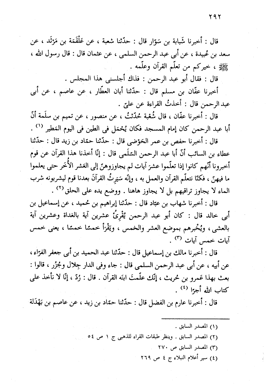 قال: أخبرنا حفص بن عمر الحَوْضى قال: حدّثنا حمّاد بن زيد قال: حدّثنا عطاء بن السائب أنّ أبا عبد الرحمن السّلَمي قال: إنّا أخذنا هذا القرآن عن قوم أخبرونا أنّهم كانوا إذا تعلّموا عشرَ آيات لم يجاوزوهنّ إلى العَشر الأُخَر حتى يعلموا ما فيهنّ، فكنّا نتعلّم القرآن والعمل به، وإنّه سَيَرِثُ القرآنَ بعدنا قوم ليشربونه شرب الماء لا يجاوز تراقيهم بل لا يجاوز ها هنا. ووضع يده على الحلق (¬٢).