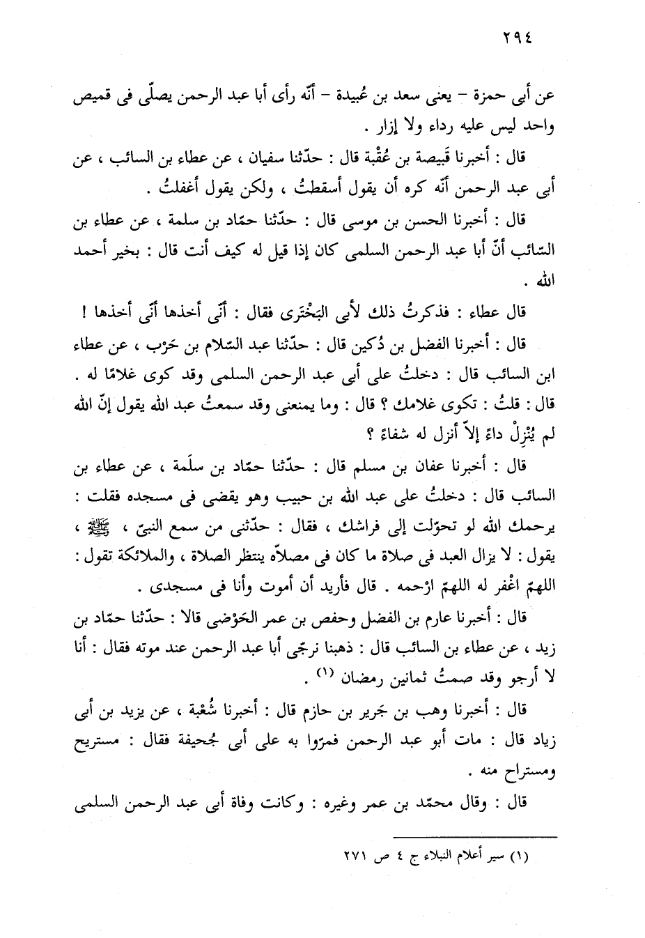 قال: أخبرنا عفان بن مسلم قال: حدّثنا حمّاد بن سلَمة، عن عطاء بن السائب قال: دخلتُ على عبد الله بن حبيب وهو يقضى في مسجده فقلت: يرحمك الله لو تحوّلت إلى فراشك، فقال: حدّثنى من سمع النبيّ، -صلى الله عليه وسلم-، يقول: لا يزال العبد في صلاة ما كان في مصلّاه ينتظر الصلاة، والملائكة تقول: اللهمّ اغْفر له اللهمّ ارْحمه. قال فأريد أن أموت وأنا في مسجدى.