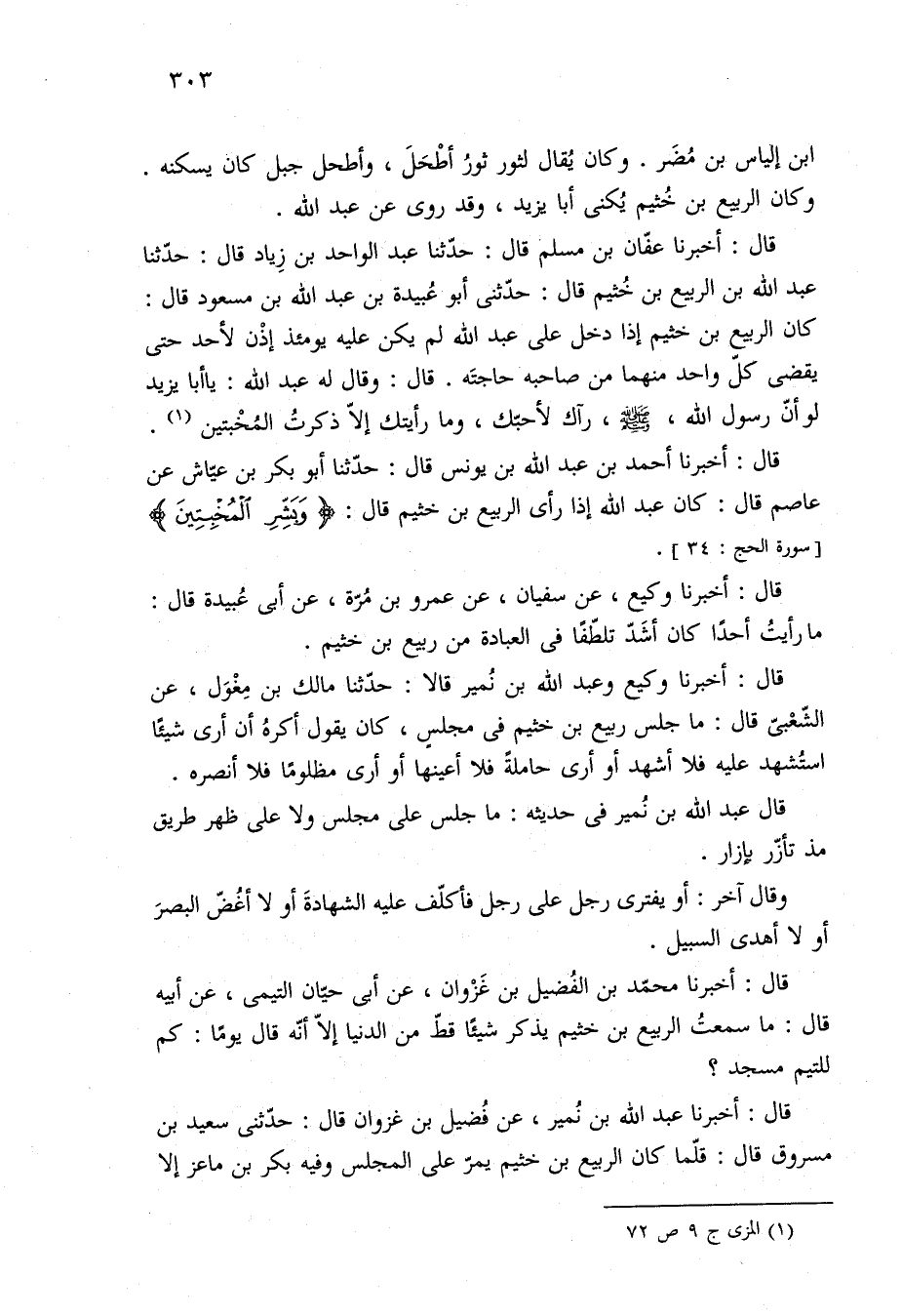 قال: أخبرنا عبد الله بن نُمير، عن فُضيل بن غزوان قال: حدّثنى سعيد بن مسروق قال: قلّما كان الربيع بن خثيم يمرّ على المجلس وفيه بكر بن ماعز إلا