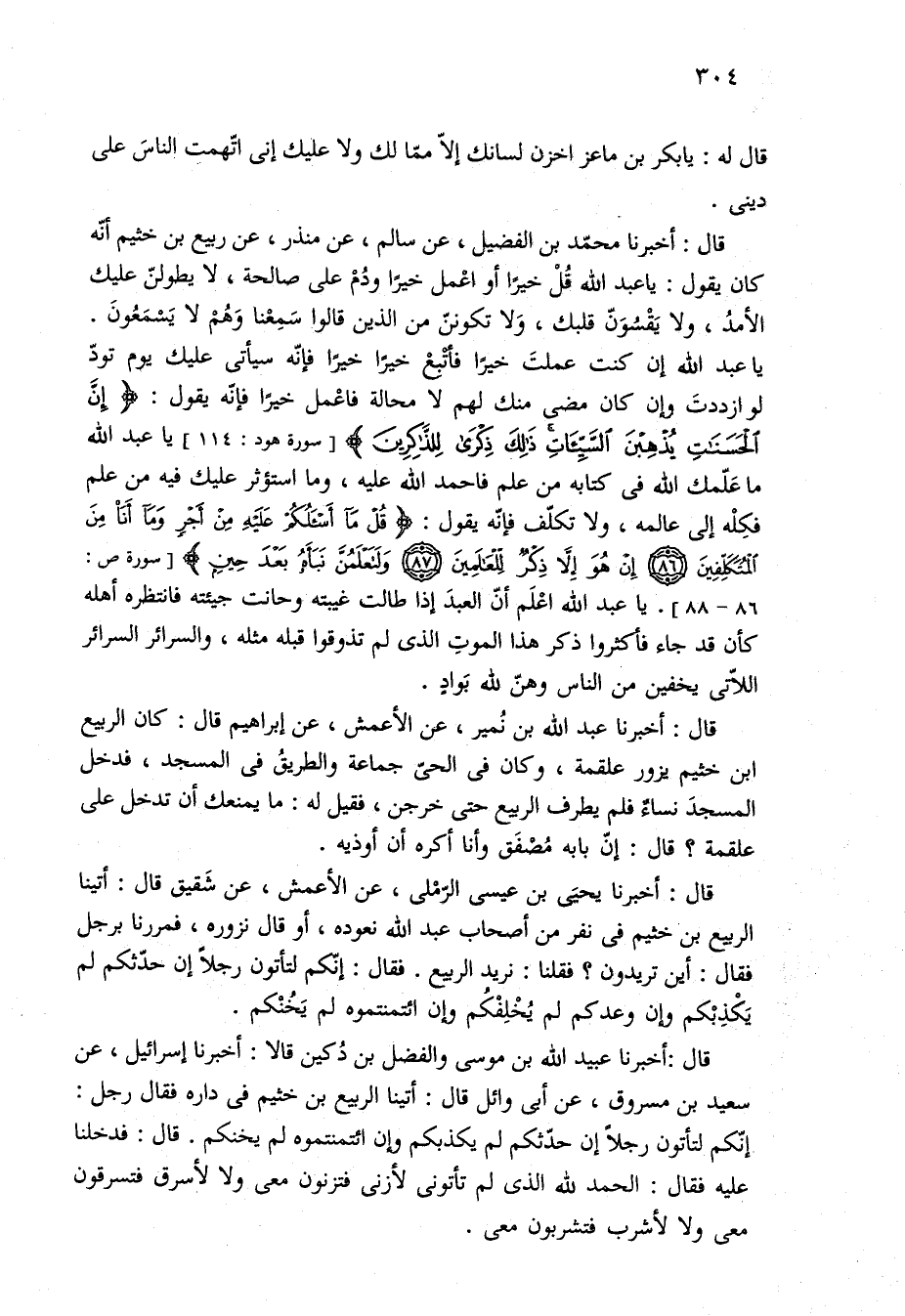 قال: أخبرنا محمّد بن الفضيل، عن سالم، عن منذر، عن ربيع بن خثيم أنّه كان يقول: يا عبد الله قُلْ خيرًا أو اعْمل خيرًا ودُمْ على صالحة، لا يطولنّ عليك الأمدُ، ولا يَقْسُوَنّ قلبك، وَلا تكوننّ من الذين قالوا سَمِعْنا وَهُمْ لا يَسْمَعُونَ. يا عبد الله أن كنت عملتَ خيرًا فأتْبِعْ خيرًا خيرًا فإنّه سيأتى عليك يوم تودّ لو ازددتَ وإن كان مضى منك لهم لا محالة فاعْمل خيرًا فإنّه يقول: {إِنَّ الْحَسَنَاتِ يُذْهِبْنَ السَّيِّئَاتِ ذَلِكَ ذِكْرَى لِلذَّاكِرِينَ} [سورة هود: ١١٤] يا عبد الله ما عَلّمك الله في كتابه من علم فاحمد الله عليه، وما استؤثر عليك فيه من علم فكِلْه إلى عالمه، ولا تكلّف فإنّه يقول: {قُلْ مَا أَسْأَلُكُمْ عَلَيْهِ مِنْ أَجْرٍ وَمَا أَنَا مِنَ الْمُتَكَلِّفِينَ (٨٦) إِنْ هُوَ إِلَّا ذِكْرٌ لِلْعَالَمِينَ (٨٧) وَلَتَعْلَمُنَّ نَبَأَهُ بَعْدَ حِينٍ} [سورة ص: ٨٦ - ٨٨]. يا عبد الله اعْلَم أنّ العبدَ إذا طالت غيبته وحانت جيئته فانتظره أهله كأن قد جاء فأكثروا ذكر هذا الموتِ الذي لم تذوقوا قبله مثله، والسرائر السرائر اللّاتى يخفين من الناس وهنّ لله بَوادٍ.