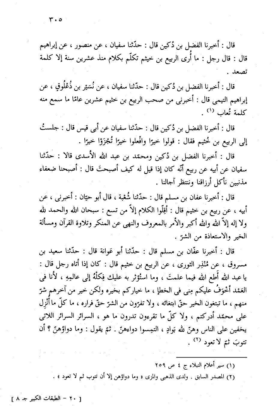قال: أخبرنا الفضل بن دُكين قال: حدّثنا سفيان، عن منصور، عن إبراهيم قال: قال رجل: ما أُرى الربيع بن خيثم تكلّم بكلام منذ عشرين سنة إلا كلمة تصعد.