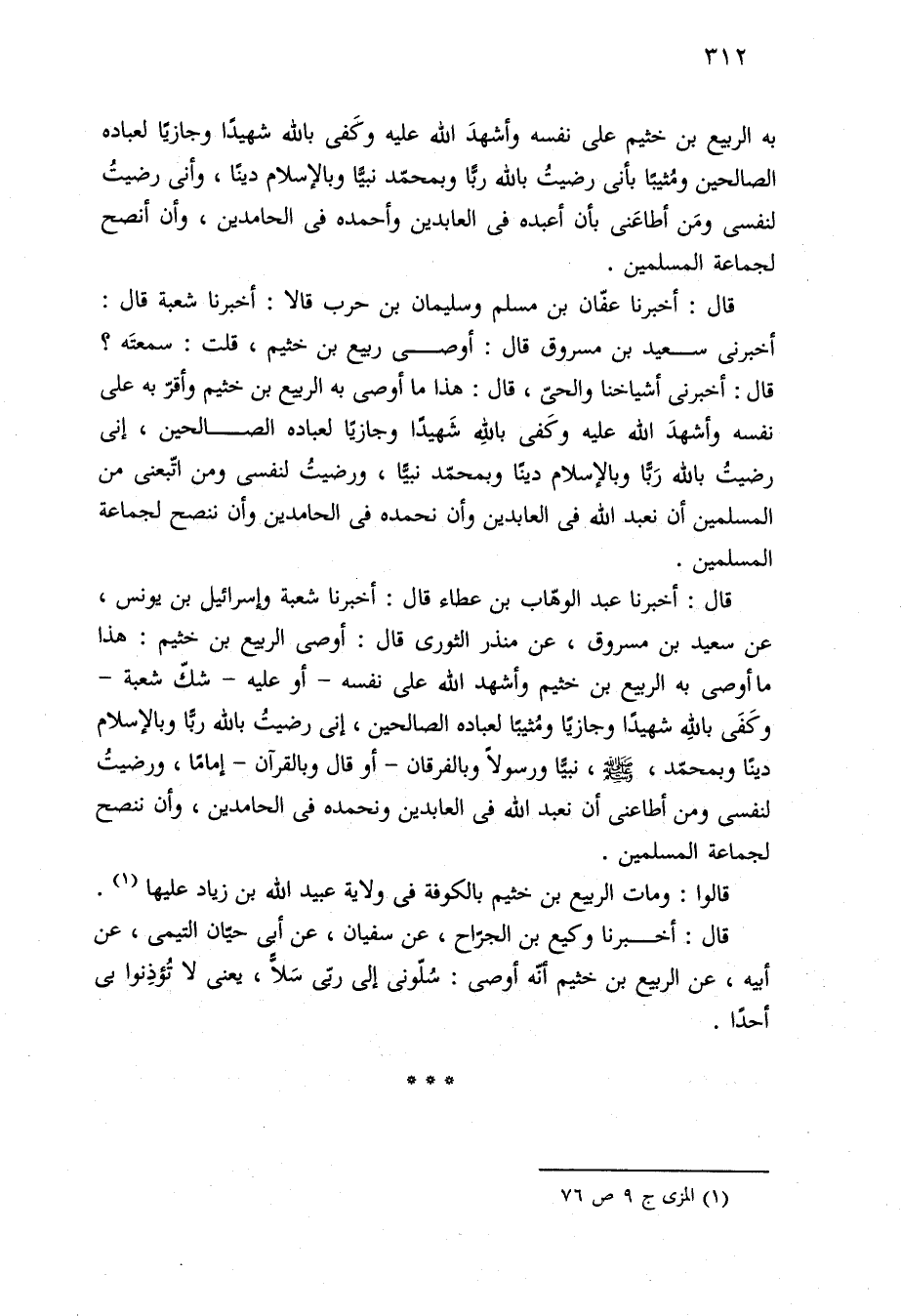 قال: أخبرنا عفّان بن مسلم وسليمان بن حرب قالا: أخبرنا شعبة قال: أخبرنى سعيد بن مسروق قال: أوصى ربيع بن خثيم، قلت: سمعتَه؟ قال: أخبرنى أشياخنا والحىّ، قال: هذا ما أوصى به الربيع بن خثيم وأقرّ به على نفسه وأشهدَ الله عليه وكَفى بالله شَهيدًا وجازيًا لعباده الصالحين، إنى رضيتُ بالله رَبًّا وبالإسلام دينًا وبمحمّد نبيًّا، ورضيتُ لنفسى ومن اتّبعنى من المسلمين أن نعبد الله في العابدين وأن نحمده في الحامدين وأن ننصح لجماعة المسلمين.