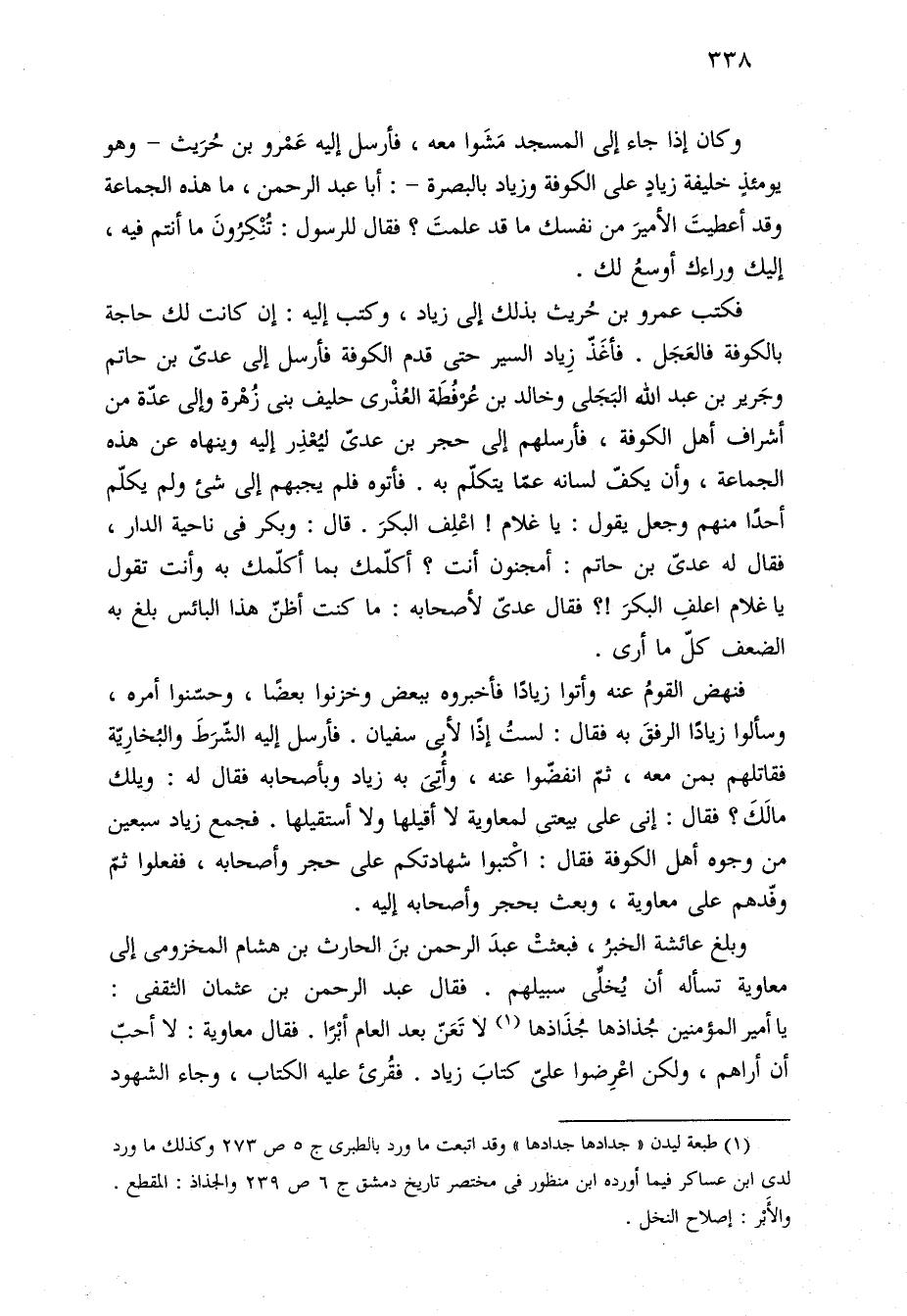 فكتب عمرو بن حُريث بذلك إلى زياد، وكتب إليه: إن كانت لك حاجة بالكوفة فالعَجَل. فأغَذّ زِياد السير حتى قدم الكوفة فأرسل إلى عديّ بن حاتم وجَرير بن عبد الله البَجَلي وخالد بن عُرْفُطَة العُذْري حليف بنى زُهْرة وإلى عدّة من أشراف أهل الكوفة، فأرسلهم إلى حجر بن عديّ ليُعْذِر إليه وينهاه عن هذه الجماعة، وأن يكفّ لسانه عمّا يتكلّم به. فأتوه فلم يجبهم إلى شئ ولم يكلّم أحدًا منهم وجعل يقول: يا غلام! اعْلِف البكرَ. قال: وبكر في ناحية الدار، فقال له عديّ بن حاتم: أمجنون أنت؟ أكلّمك بما أكلّمك به وأنت تقول يا غلام اعلفِ البكرَ! ؟ فقال عديّ لأصحابه: ما كنت أظنّ هذا البائس بلغ به الضعف كلّ ما أرى.