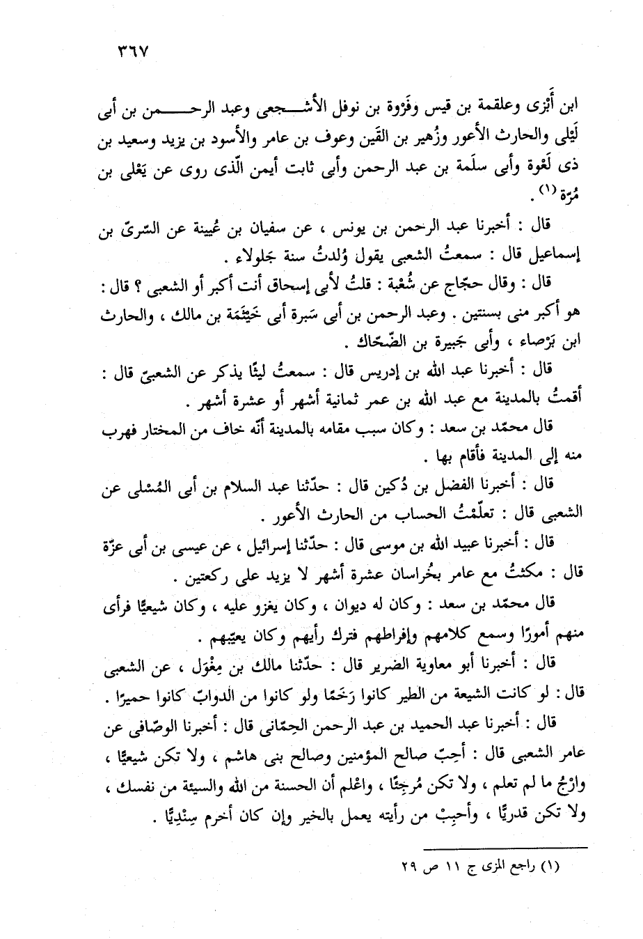 قال: أخبرنا عبد الحميد بن عبد الرحمن الحِمّاني قال: أخبرنا الوصّافي عن عامر الشعبي قال: أحِبّ صالح المؤمنين وصالح بني هاشم، ولا تكن شيعيًّا، وارْجُ ما لم تعلم، ولا تكن مُرجِئًا، واعْلم أن الحسنة من الله والسيئة من نفسك، ولا تكن قدريًّا، وأحبِبْ من رأيته يعمل بالخير وإن كان أخرم سِنْدِيًّا.