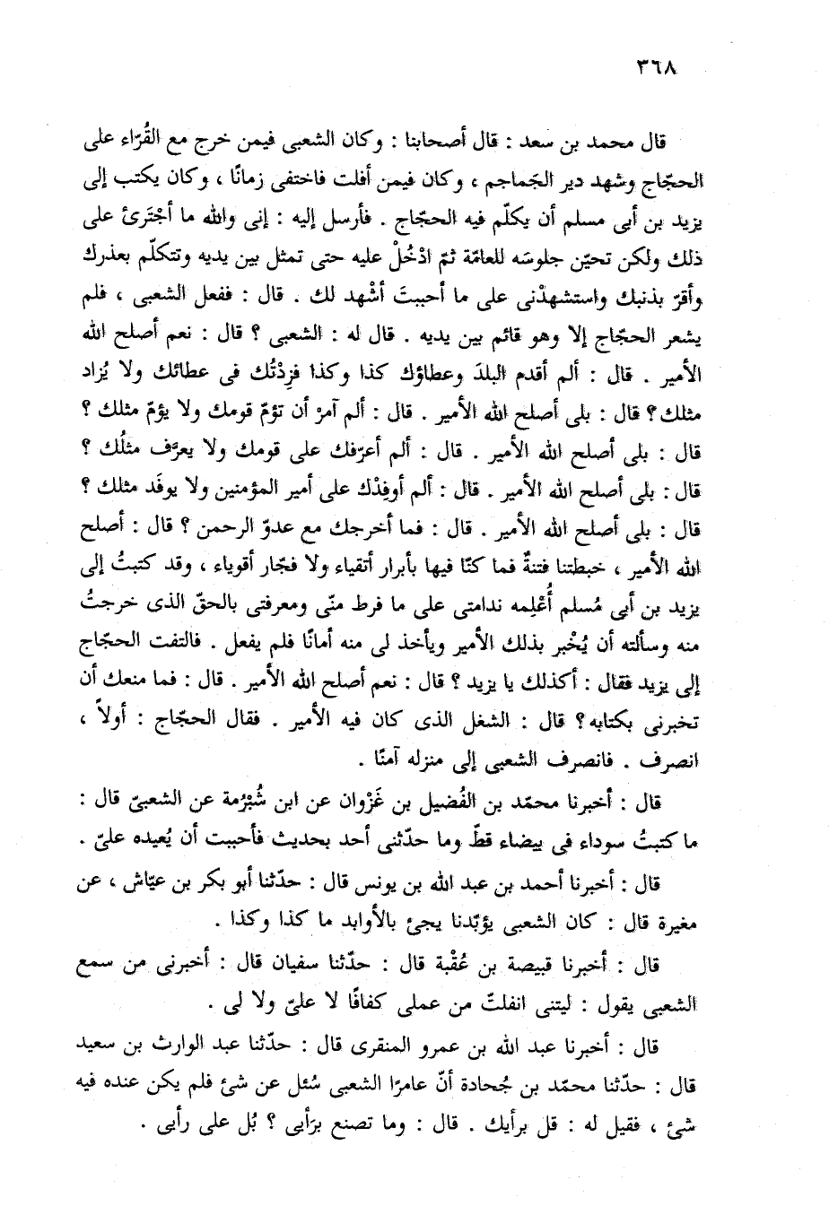 قال: أخبرنا محمّد ين الفُضيل بن غَزْوان عن ابن شُبْرُمة عن الشعبيّ قال: ما كتبتُ سوداء في بيضاء قطّ، وما حدّثنى أحد بحديث فأحببت أن يُعيده عليّ
