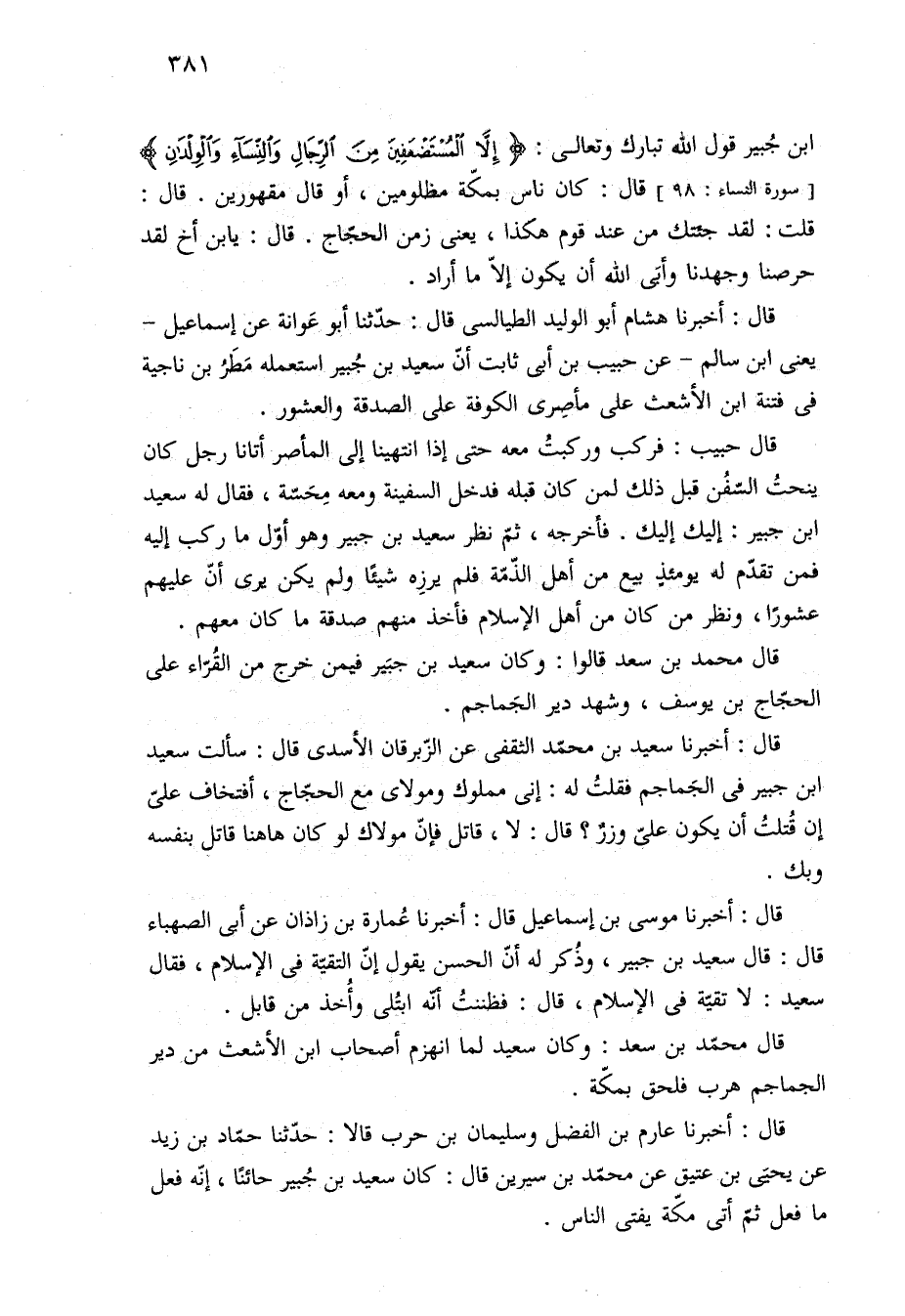 ابن جُبير قول الله تبارك وتعالى: {إِلَّا الْمُسْتَضْعَفِينَ مِنَ الرِّجَالِ وَالنِّسَاءِ وَالْوِلْدَانِ} [سورة النساء: ٩٨] قال: كان ناس بمكّهّ مظلومين، أو قال مقهورين. قال: قلت: لقد جئتك من عند قوم هكذا، يعني زمن الحجّاج. قال: يا بن أخ لقد حرصنا وجهدنا وأبَى الله أن يكون إلّا ما أراد.