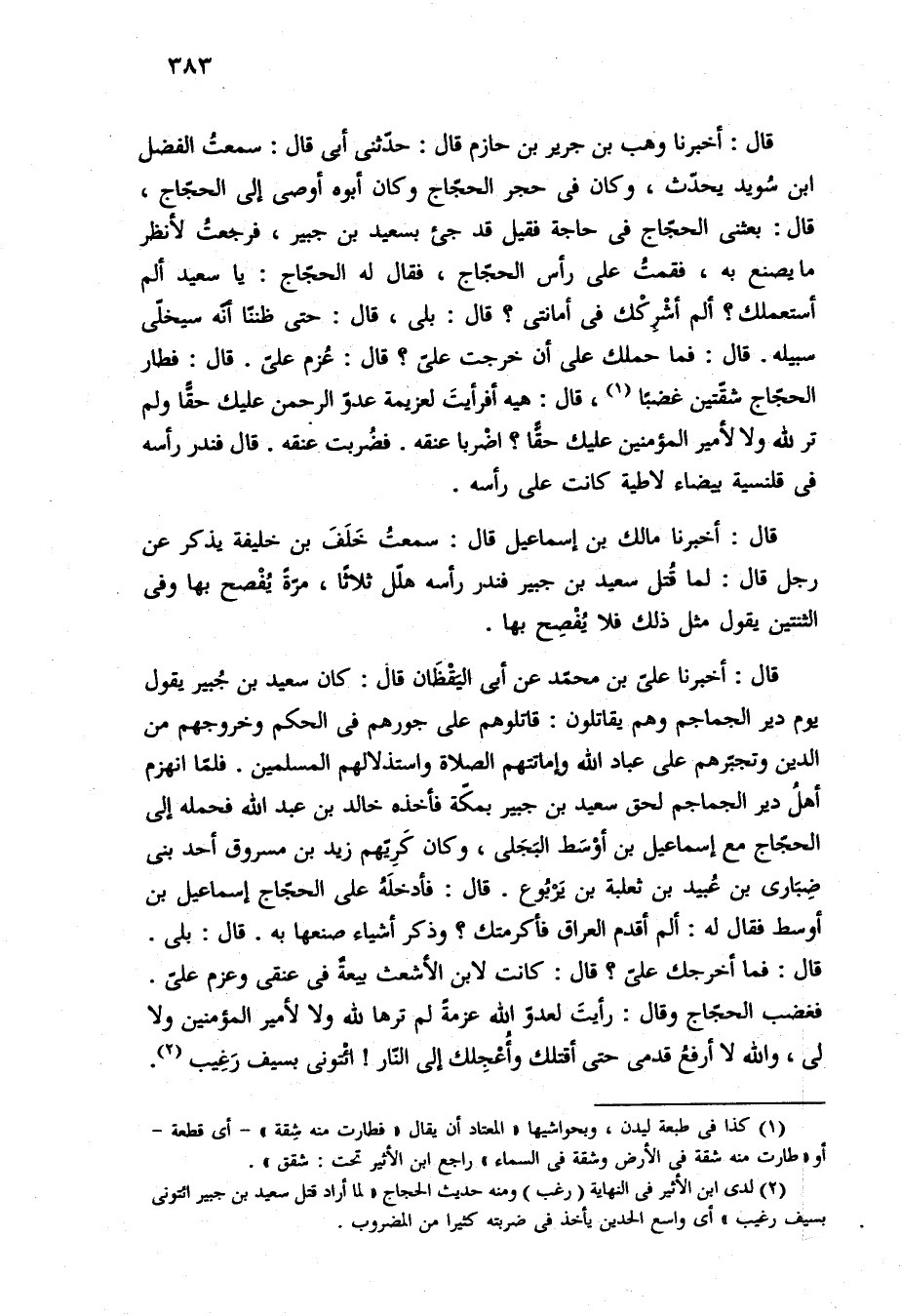 قال: أخبرنا عليّ بن محمّد عن أبي اليَقْظَان قال: كان سعيد بن جُبير يقول يوم دير الجماجم وهم يقاتلون: قاتلوهم على جورهم في الحكم وخروجهم من الدين وتجبّرهم على عباد الله وإماتتهم الصلاة واستذلالهم المسلمين. فلمّا انهزم أهلُ دير الجماجم لحق سعيد بن جبير بمكّة فأخذه خالد بن عبد الله فحمله إلى الحجّاج مع إسماعيل بن أوْسَط البَجَلي، وكان كَرِيّهم زيد بن مسروق أحد بني ضِبَارى بن عُبيد بن ثعلبة بن يَرْيُوع. قال: فأدخلَهُ على الحجّاج إسماعيل بن أوسط فقال له: ألم أقدم العراق فأكرمتك؟ وذكر أشياء صنعها به. قال: بلى. قال: فما أخرجك عليّ؟ قال: كانت لابن الأشعث بيعةٌ في عنقي وعزم عليّ. فغضب الحجّاج وقال: رأيتَ لعدوّ الله عزمةً لم ترها لله ولا لأمير المؤمنين ولا لي، والله لا أرفعُ قدمى حتى أقتلك وأُعْجِلك إلى النّار! ائْتونى بسيف رَغِيب (¬٢).