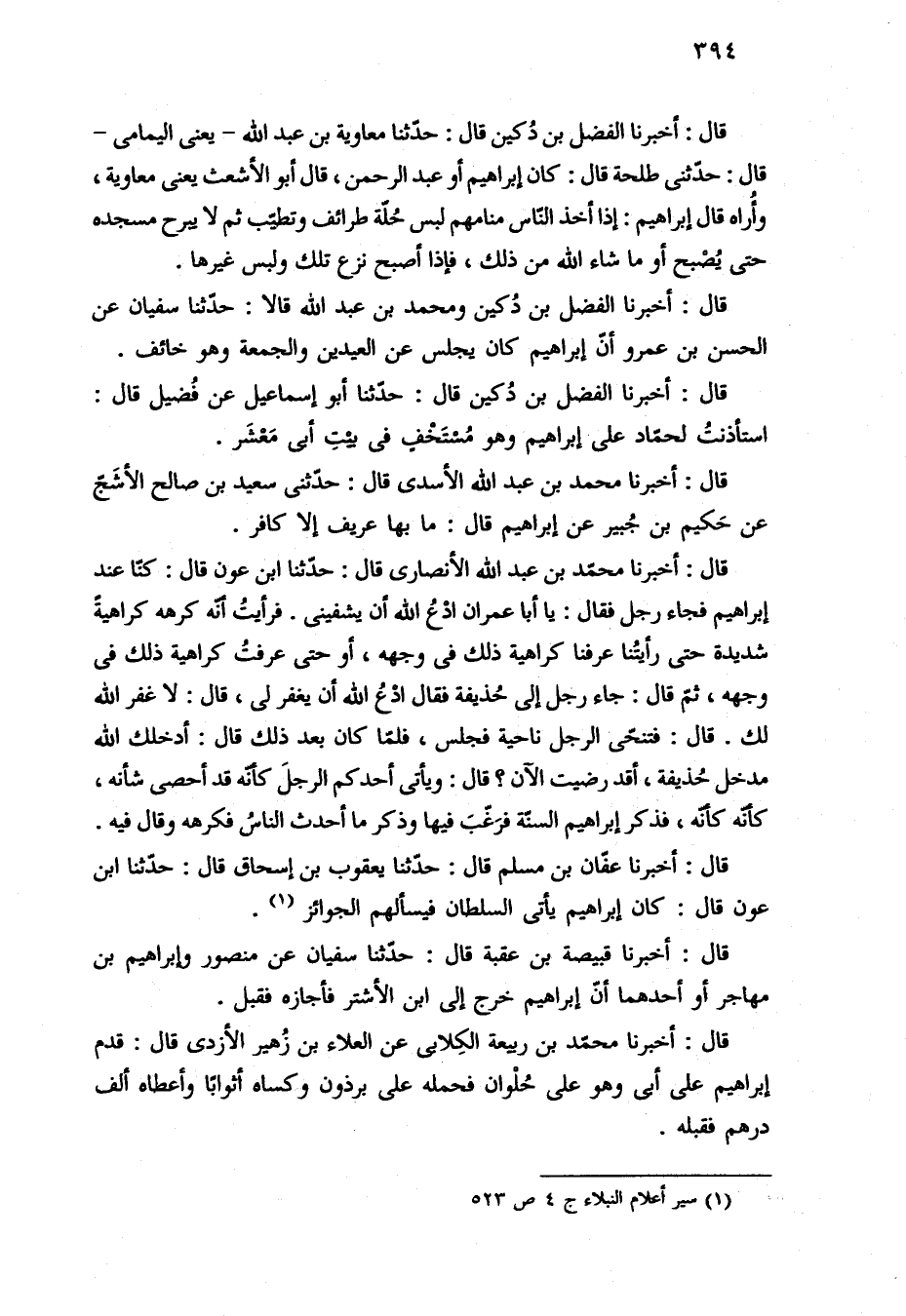 قال: أخبرنا الفضل بن دُكين قال: حدّثنا أبو إسماعيل عن فُضيل قال: استأذنتُ لحمّاد على إبراهيم وهو مُسْتَخْفٍ في بيْتِ أبي مَعْشَر.