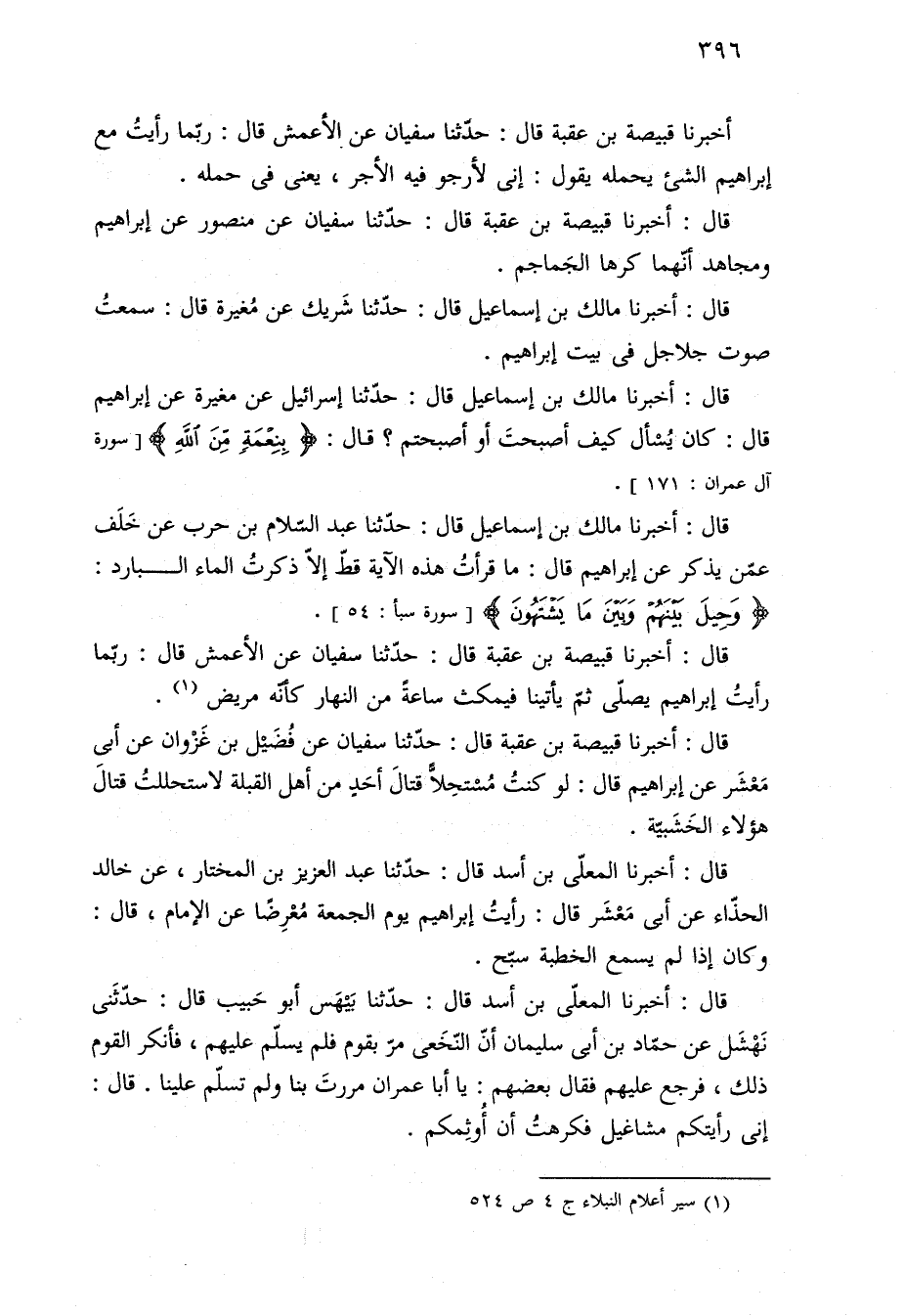 قال: أخبرنا قبيصة بن عقبة قال: حدّثنا سفيان عن الأعمش قال: ربّما رأيتُ إبراهيم يصلّي ثمّ يأتينا فيمكث ساعةً من النهار كأنّه مريض (¬١).