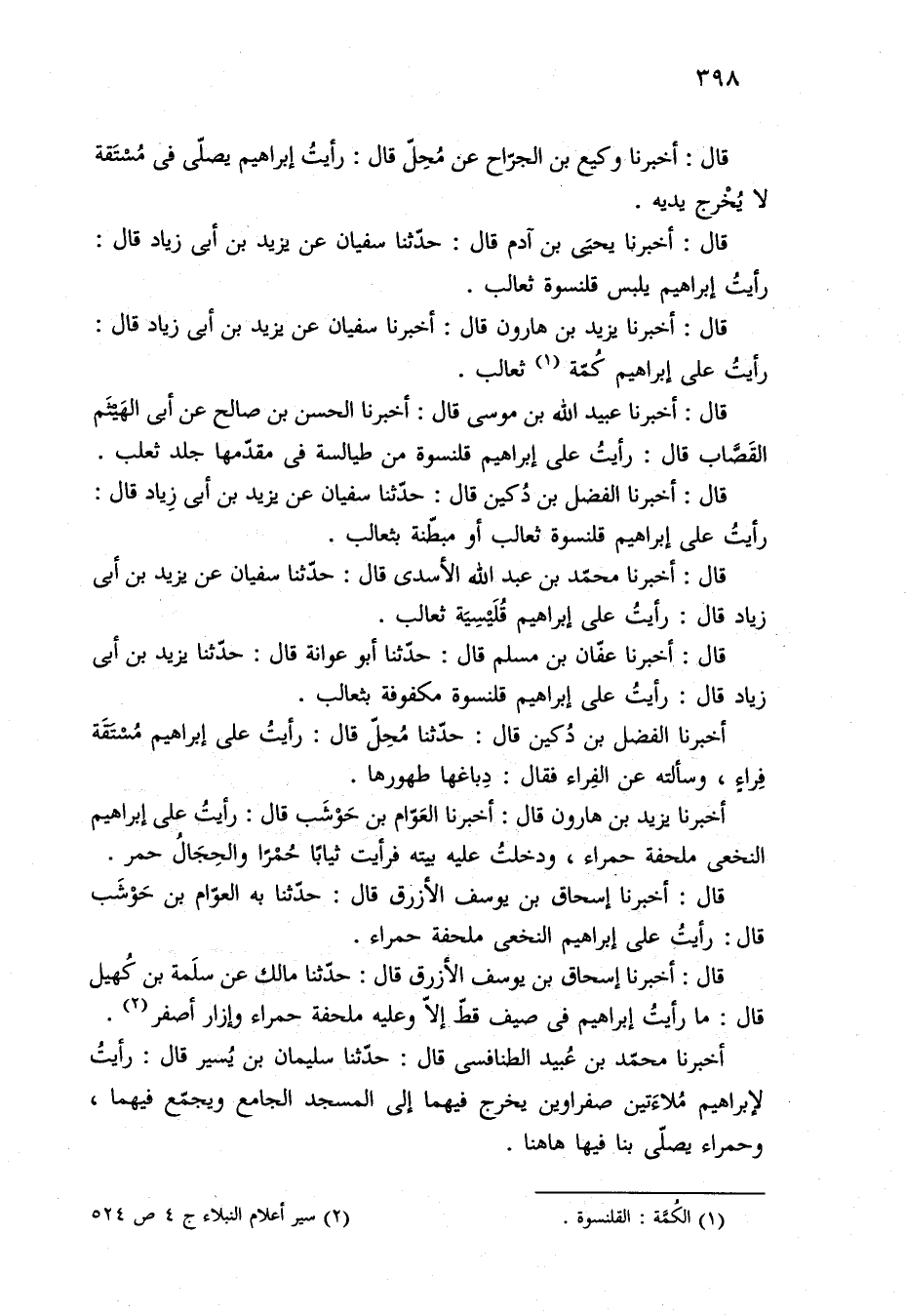 قال: أخبرنا إسحاق بن يوسف الأزرق قال: حدّثنا مالك عن سلَمة بن كُهيل قال: ما رأيتُ إبراهيم في صيف قطّ إلّا وعليه ملحفة حمراء وإزار أصفر (¬٢).