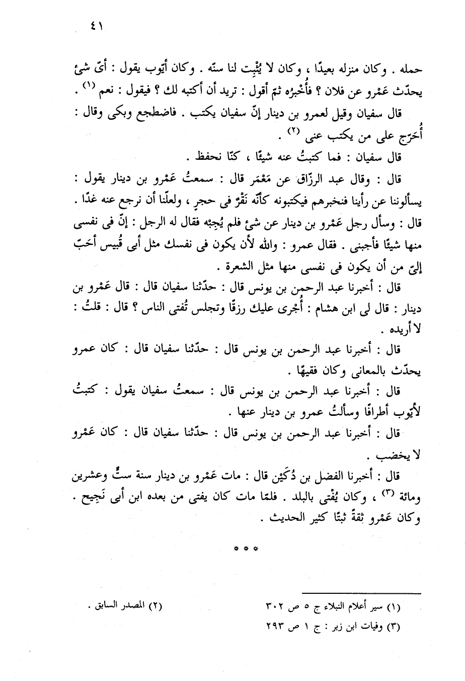 قال: أخبرنا عبد الرحمن بن يونس قال: سمعتُ سفيان يقول: كتبتُ لأيّوب أطرافًا وسألتُ عمرو بن دينار عنها.
