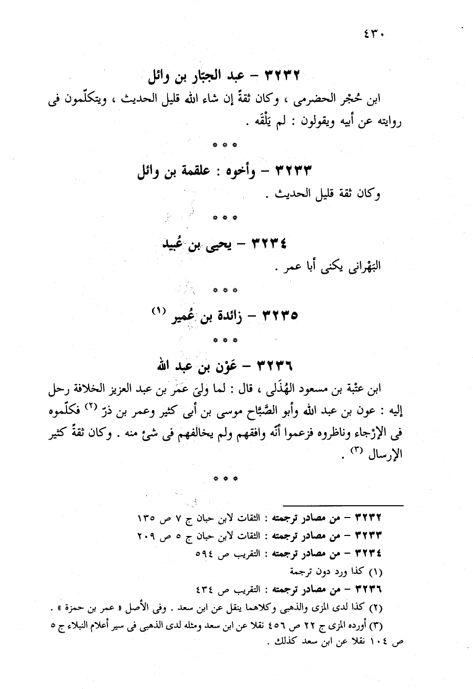 ٣٢٣٣ - من مصادر ترجمته: الثقات لابن حبان ج ٥ ص ٢٠٩.