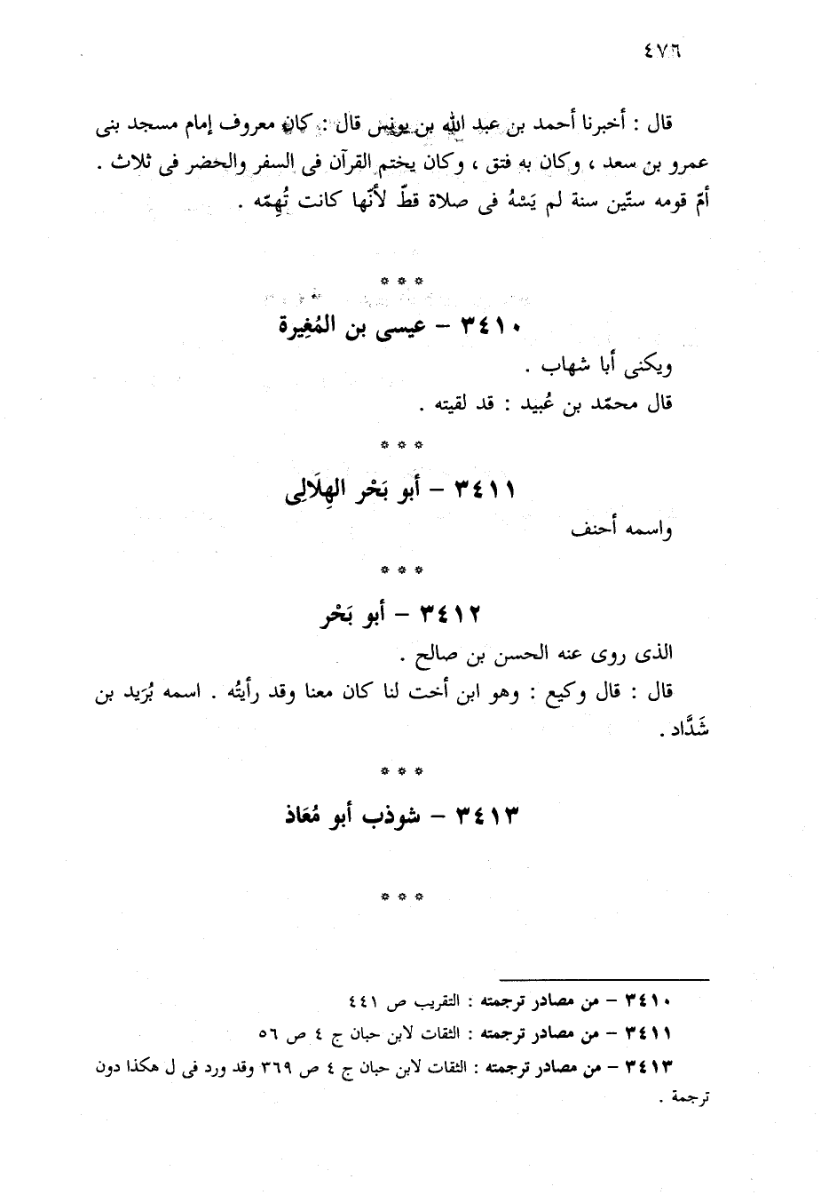 ٣٤١٣ - من مصادر ترجمته: الثقات لابن حبان ج ٤ ص ٣٦٩ وقد ورد في ل هكذا دون ترجمة.