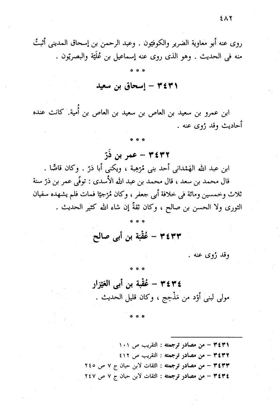 ٣٤٣٤ - من مصادر ترجمته: الثقات لابن حبان ج ٧ ص ٢٤٧.
