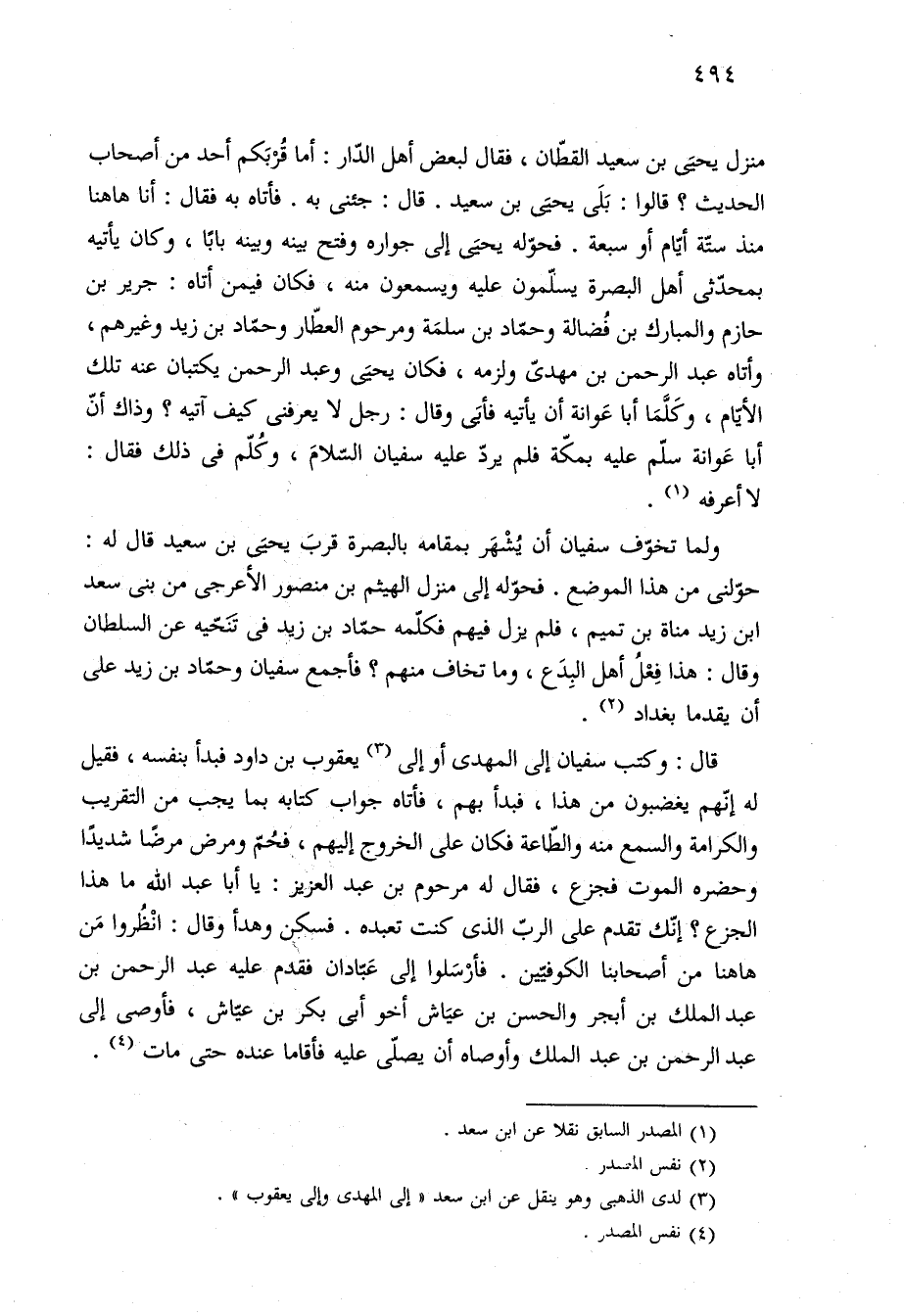 ولما تخوّف سفيان أن يُشْهَر بمقامه بالبصرة قربَ يحيَى بن سعيد قال له: حوّلنى من هذا الموضع. فحوّله إلى منزل الهيثم بن منصور الأعرجي من بنى سعد ابن زيد مناة بن تميم. فلم يزل فيهم فكلّمه حمّاد بن زيد في تَنَحّيه عن السلطان وقال: هذا فِعْلُ أهل البِدَع، وما تخاف منهم؟ فأجمع سفيان وحمّاد بن زيد على أن يقدما بغداد (¬٢).