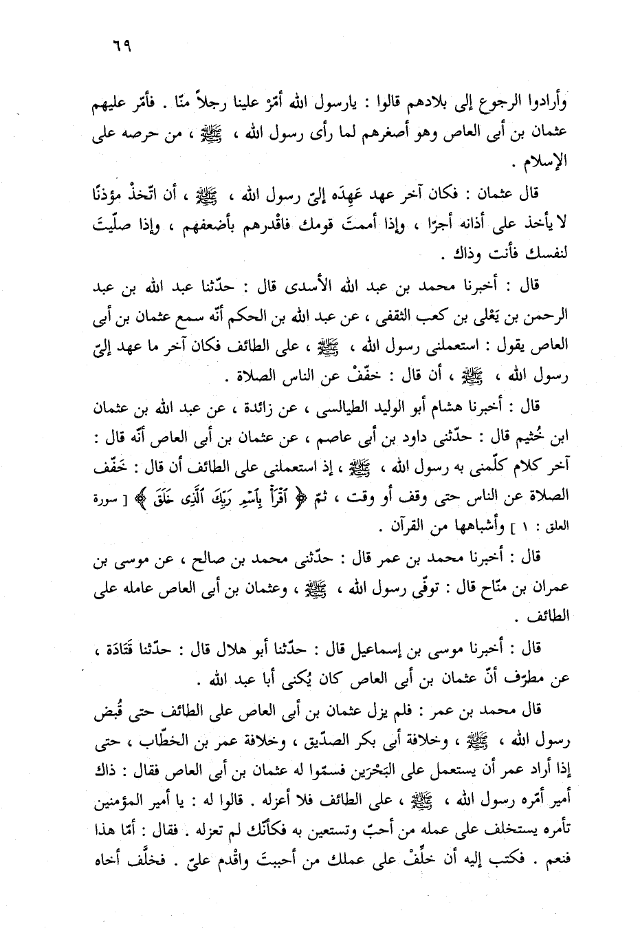 قال: أخبرنا محمد بن عبد الله الأسدى قال: حدّثنا عبد الله بن عبد الرحمن بن يَعْلى بن كعب الثقفى، عن عبد الله بن الحكم أنّه سمع عثمان بن أبي العاص يقول: استعملنى رسول الله، - صلى الله عليه وسلم -، على الطائف فكان آخر ما عهد إليّ رسول الله، - صلى الله عليه وسلم -، أن قال: خفّفْ عن الناس الصلاة.