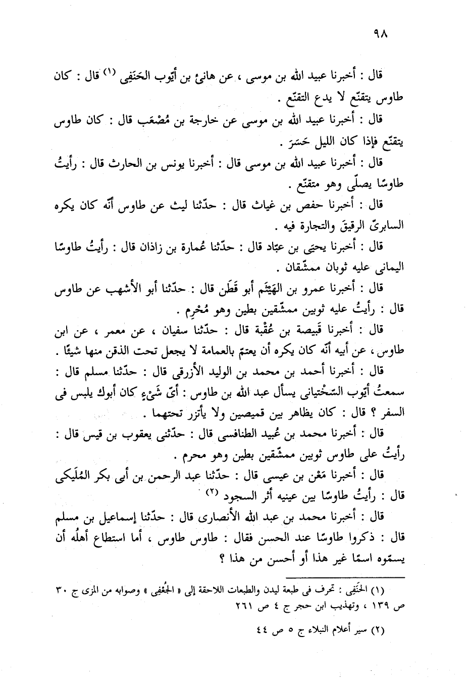 قال: أخبرنا أحمد بن محمد بن الوليد الأزرقى قال: حدّثنا مسلم قال: سمعتُ أيّوب السّخْتيانى يسأل عبد الله بن طاوس: أىّ شَيْءٍ كان أبوك يلبس في السفر؟ قال: كان يظاهر بين قميصين ولا يأتزر تحتهما.