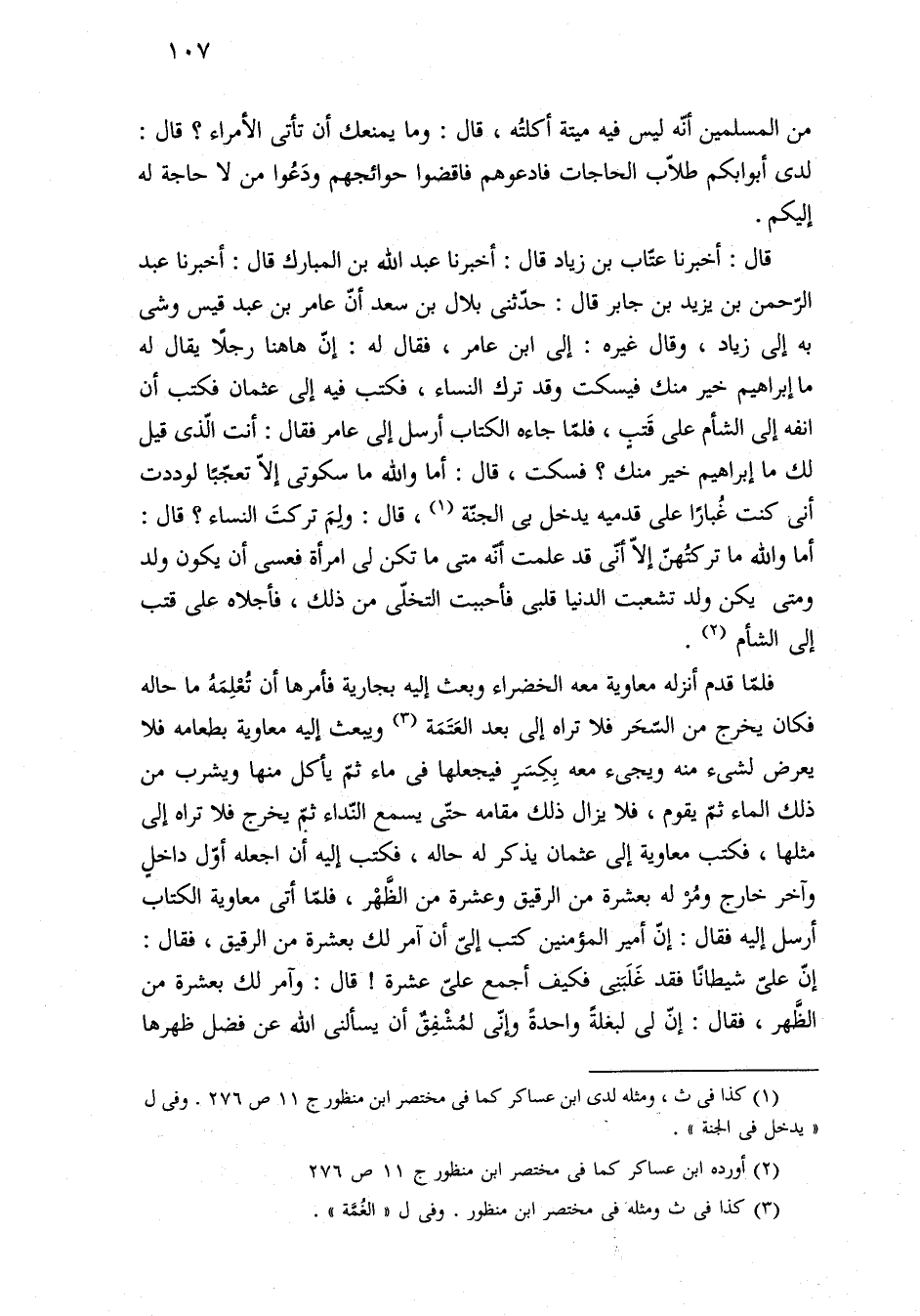 فلمّا قدم أنزله معاوية معه الخضراء وبعث إليه بجارية فأمرها أن تُعْلِمَهُ ما حاله فكان يخرج من السّحَر فلا تراه إلى بعد العَتَمَة (¬٣) ويبعث إليه معاوية بطعامه فلا يعرض لشئ منه ويجئ معه بِكِسَر فيجعلها فى ماء ثمّ يأكل منها ويشرب من ذلك الماء ثمّ يقوم، فلا يزال ذلك مقامه حتّى يسمع النّداء ثمّ يخرج فلا تراه إلى مثلها، فكتب معاوية إلى عثمان يذكر له حاله، فكتب إليه أن اجعله أوّل داخلٍ وآخر خارج ومُرْ له بعشرة من الرقيق وعشرة من الظَّهْر، فلمّا أتى معاوية الكتاب أرسل إليه فقال: إنّ أمير المؤمنين كتب إلى أن آمر لك بعشرة من الرقيق، فقال: إنّ عليّ شيطانًا فقد غَلَبَنِى فكيف أجمع عليّ عشرة! قال: وآمر لك بعشرة من الظَّهر، فقال: إنّ لى لبغلة واحدةً وإنّى لمُشْفِقٌ أن يسألنى الله عن فضل ظهرها