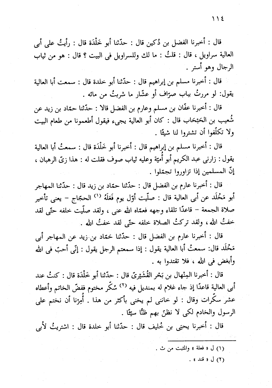 قال: أخبرنا الفضل بن دُكين قال: حدّثنا أبو خَلْدَة قال: رأيتُ على أبي العالية سراويل، قال: قلتُ: ما لك وللسراويل في البيت؟ قال: هو من ثياب الرجال وهو أستر.