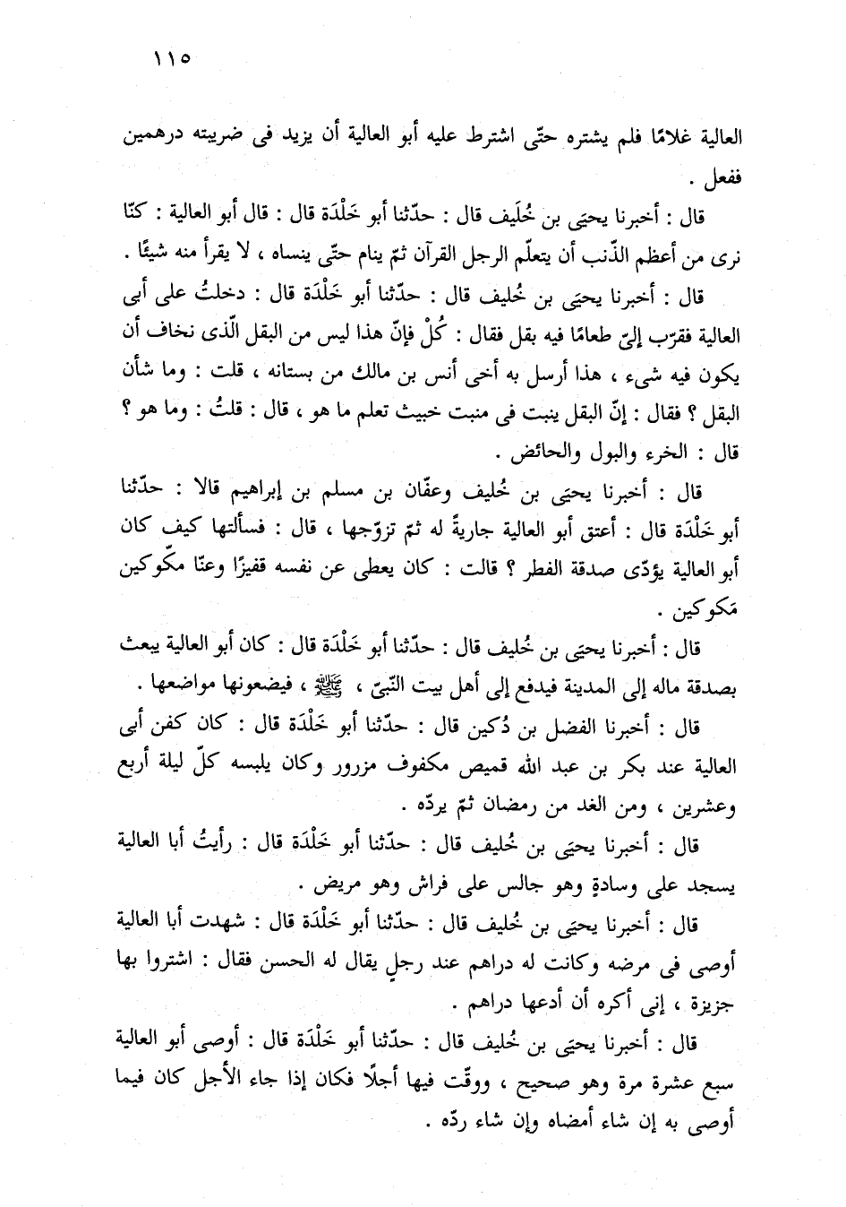 قال: أخبرنا يحيَى بن خُليف قال: حدّثنا أبو خَلْدَة قال: شهدت أبا العالية أوصى في مرضه وكانت له دراهم عند رجلٍ يقال له الحسن فقال: اشتروا بها جزيزة، إنى أكره أن أدعها دراهم.
