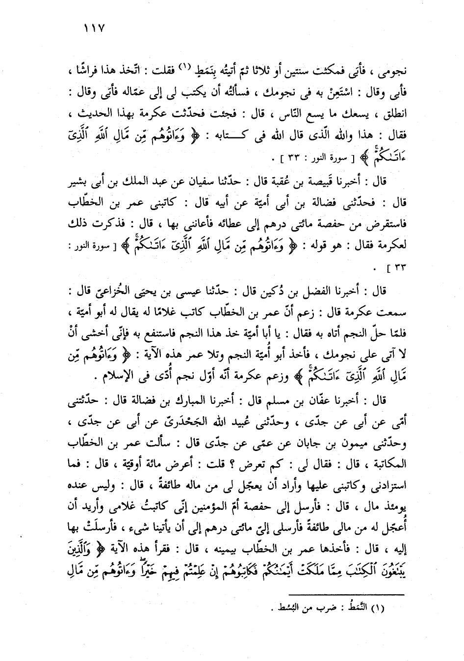 قال: أخبرنا الفضل بن دُكين قال: حدّثنا عيسى بن يحيَى الخُزاعىّ قال: سمعت عِكْرِمَة قال: زعم أنّ عمر بن الخطّاب كاتب غلامًا له يقال له أبو أميّة، فلمّا حلّ النجم أتاه به فقال: يا أبا أميّة خذ هذا النجم فاممتنفع به فإنّى أخشى أنْ لا آتى على نجومك، فأخذ أبو أُميّة النجم وتلا عمر هذه الآية: {وَآتُوهُمْ مِنْ مَالِ اللَّهِ الَّذِي آتَاكُمْ} وزعم عِكْرِمَة أنّه أوّل نجم أُدّى في الإسلام.