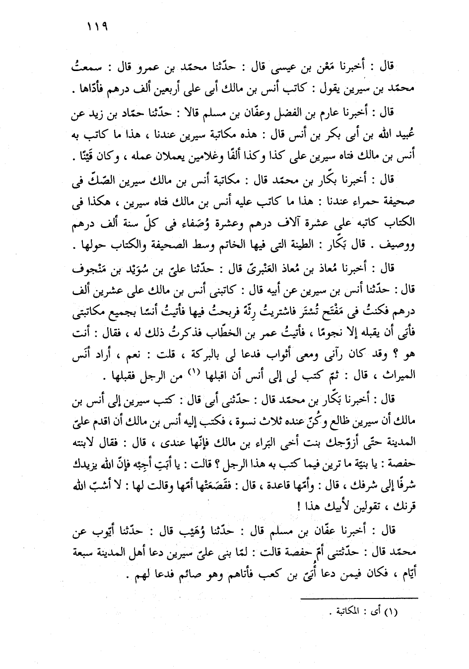 قال: أخبرنا بكّار بن محمّد قال: مكاتبة أنس بن مالك سيرين الصّكّ في صحيفة حمراء عندنا: هذا ما كاتب عليه أنس بن مالك فتاه سيرين، هكذا في الكتاب كاتبه على عشرة آلاف درهم وعشرة وُصَفاء في كلّ سنة ألف درهم ووصيف. قال بَكّار: الطينة التى فيها الخاتم وسط الصحيفة والكتاب حولها.