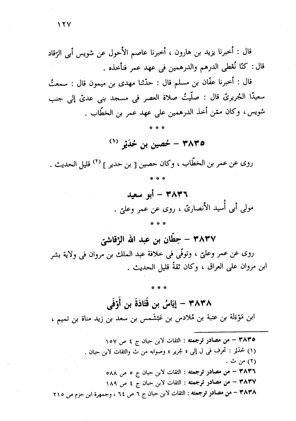 ٣٨٣٥ - من مصادر ترجمته: الثقات لابن حبان ج ٤ ص ١٥٧.