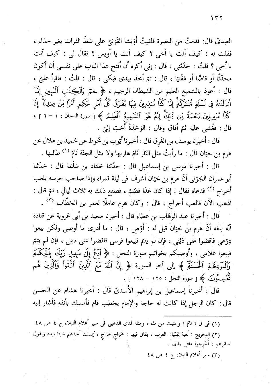 قال: أخبرنا موسى بن إسماعيل قال: حدّثنا حَمّاد بن سَلَمَة قال: حَدّثنا أبو عمران الجَوْنى أنّ هرم بن حَيّان أشرف في ليلة قمراء وإذا صاحب حرسه يلعب أخراج (¬٢) فدعاه فقال: إذا كان غدًا فصُمْ، فصنع ذلك به ثلاث ليالٍ، ثمّ قال: اذهب الآن فالعب أخراج، قال: وكان هرم عاملًا لعمر بن الخطّاب (¬٣).