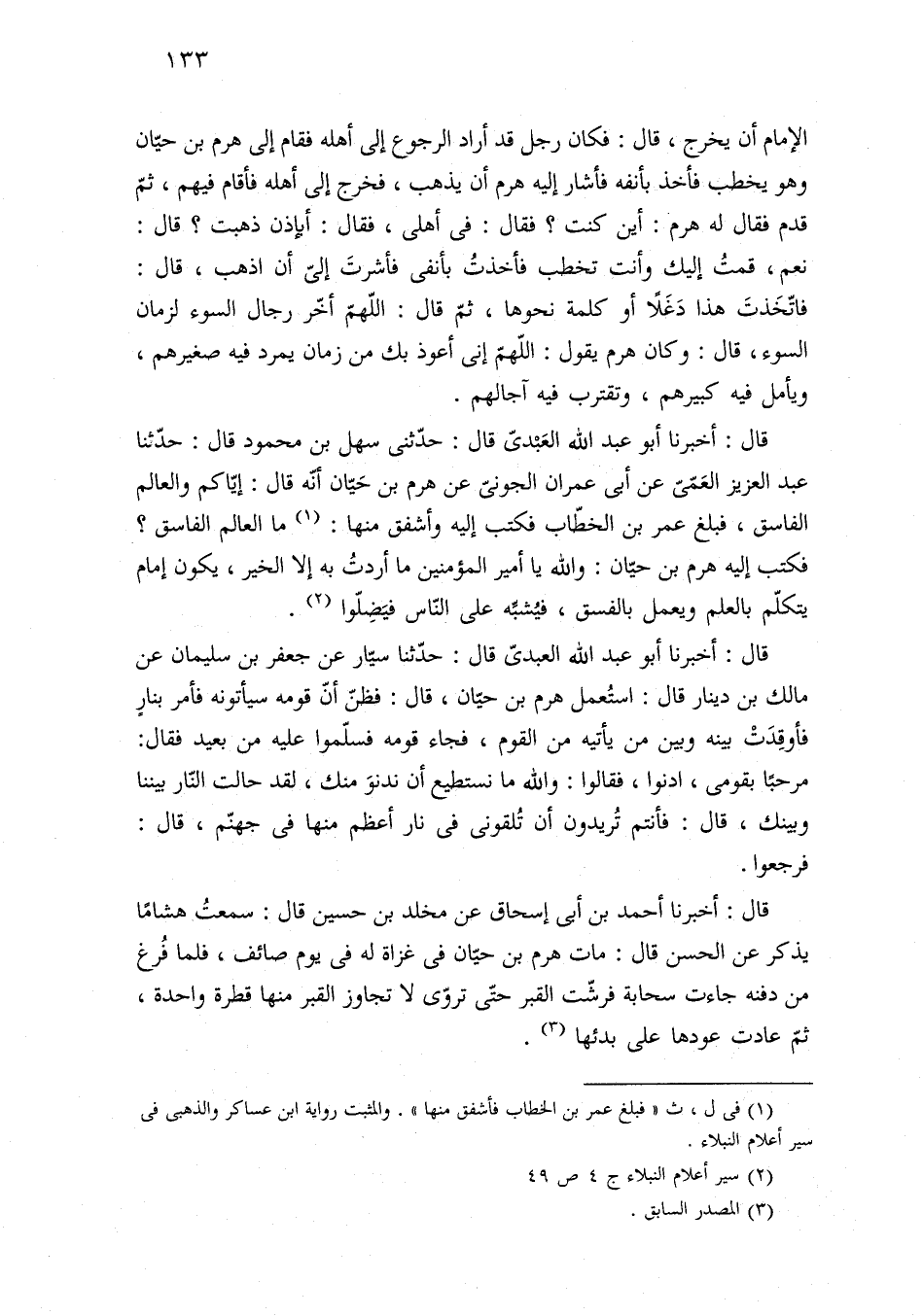 قال: أخبرنا أبو عبد الله العَبْدىّ قال: حدّثنى سهل بن محمود قال: حدّثنا عبد العزيز العَمّىّ عن أبى عمران الجونىّ عن هرم بن حَيّان أنّه قال: إيّاكم والعالم الفاسق، فبلغ عمر بن الخطّاب فكتب إليه وأشفق منها: (¬١) ما العالم الفاسق؟ فكتب إليه هرم بن حيّان: والله يا أمير المؤمنين ما أردتُ به إلا الخير، يكون إمام يتكلّم بالعلم ويعمل بالفسق، فيُشبِّه على النّاس فيَضِلّوا (¬٢).