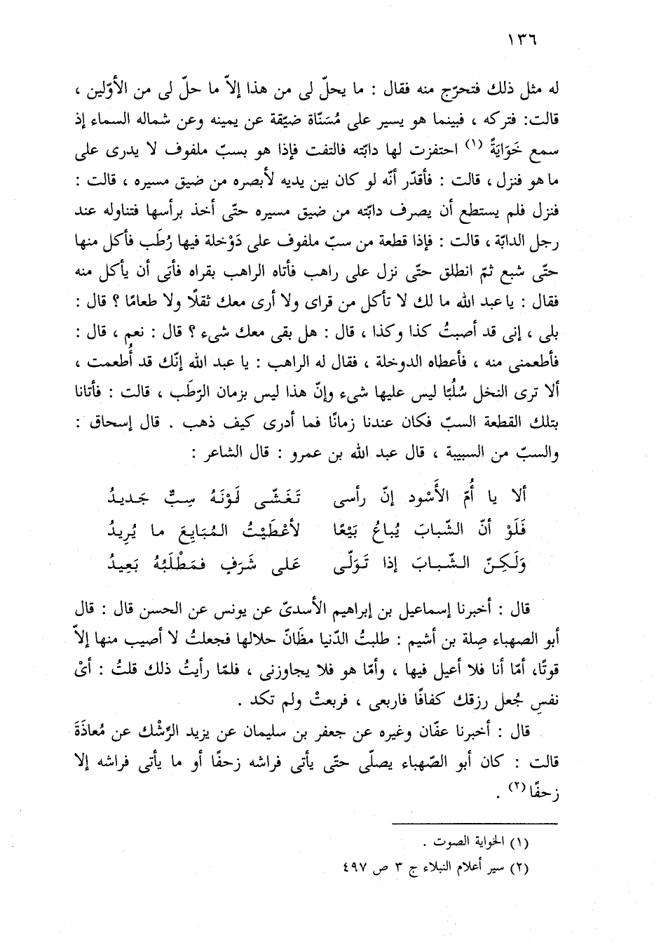 له مثل ذلك فتحرّج منه فقال: ما يحلّ لى من هذا إلّا ما حلّ لى من الأوّلين، قالت: فتركه، فبينما هو يسير على مُسَنّاة ضيّقة عن يمينه وعن شماله السماء إذ سمع خَوَايَةً (¬١) احتفزت لها دابّته فالتفت فإذا هو بسبّ ملفوف لا يدرى على ما هو فنزل، قالت: فأقدّر أنّه لو كان بين يديه لأبصره من ضيق مسيره، قالت: فنزل فلم يستطع أن يصرف دابّته من ضيق مسيره حتّى أخذ برأسها فتناوله عند رجل الدابّة، قالت: فإذا قطعة من سبّ ملفوف على دَوْخلة فيها رُطَب فأكل منها حتّى شبع ثمّ انطلق حتّى نزل على راهب فأتاه الراهب بقراه فأبَى أن يأكل منه فقال: يا عبد الله ما لك لا تأكل من قراى ولا أرى معك ثقلًا ولا طعامًا؟ قال: بلى، إنى قد أصبتُ كذا وكذا، قال: هل بقى معك شئ؟ قال: نعم، قال: فأطعمنى منه، فأعطاه الدوخلة، فقال له الراهب: يا عبد الله إنّك قد أُطعمت، ألا ترى النخل سُلُبًا ليس عليها شيء وإنّ هذا ليس بزمان الرّطَب، قالت: فأتانا بتلك القطعة السبّ فكان عندنا زمانًا فما أدرى كيف ذهب. قال إسحاق: والسبّ من السبيبة، قال عبد الله بن عمرو: قال الشاعر: