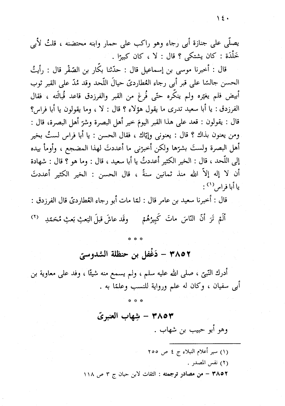 ٣٨٥٢ - من مصادر ترجمته: الثقات لابن حبان ج ٣ ص ١١٨.