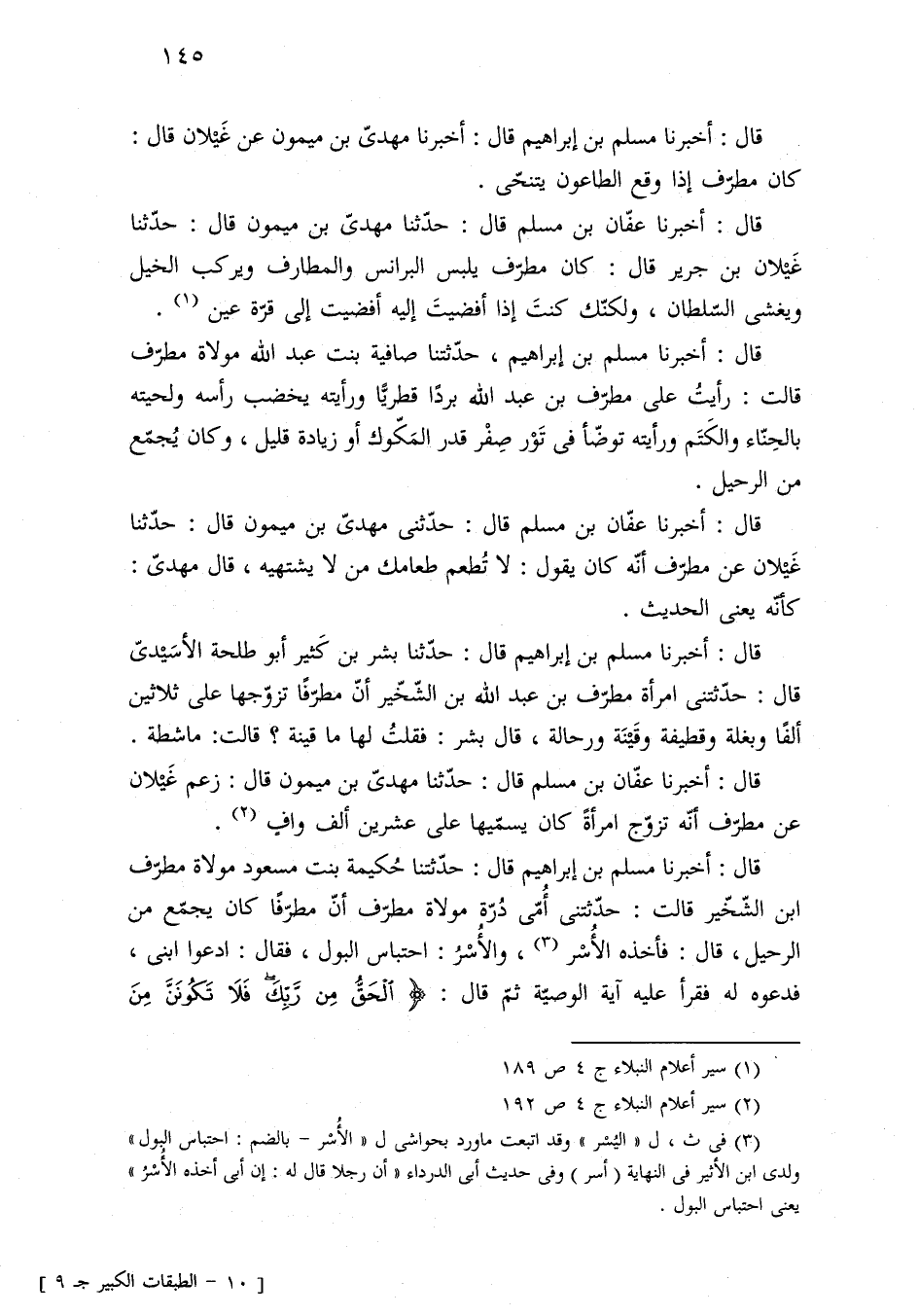 قال: أخبرنا مسلم بن إبراهيم قال: حدّثتنا حُكيمة بنت مسعود مولاة مطرّف ابن الشّخّير قالت: حدثتنى أُمّى دُرّة مولاة مطرّف أنّ مطرّفًا كان يجمّع من الرحيل، قال: فأخذه الأُسْر (¬٣)، والأُسْرُ: احتباس البول، فقال: ادعوا ابنى، فدعوه له فقرأ عليه آية الوصيّة ثمّ قال: {الْحَقُّ مِنْ رَبِّكَ فَلَا تَكُونَنَّ مِنَ