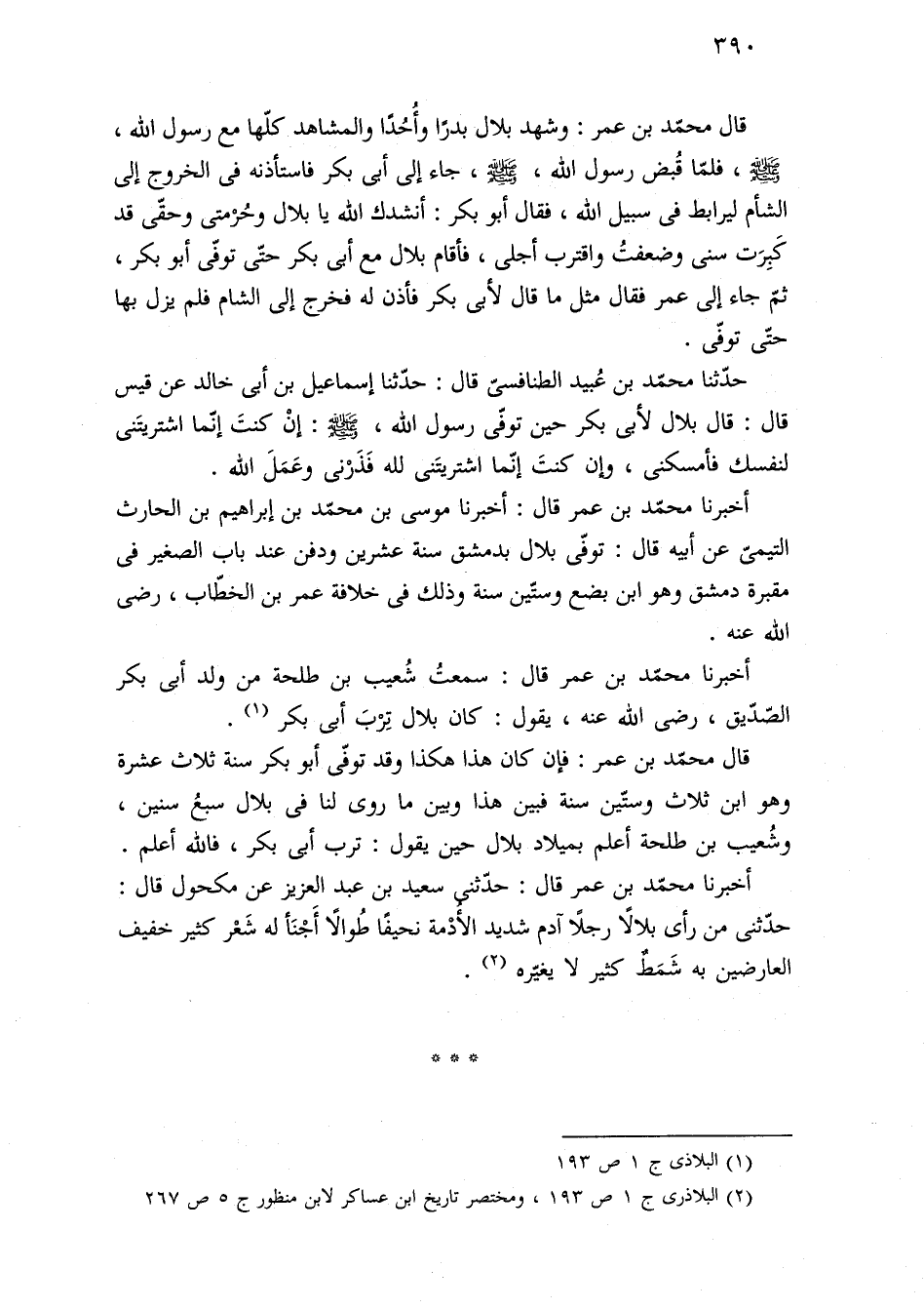 أخبرنا محمّد بن عمر قال: أخبرنا موسى بن محمّد بن إبراهيم بن الحارث التيميّ عن أبيه قال: توفّى بلال بدمشق سنة عشرين ودفن عند باب الصغير فى مقبرة دمشق وهو ابن بضع وستّين سنة وذلك فى خلافة عمر بن الخطّاب، رضى الله عنه.