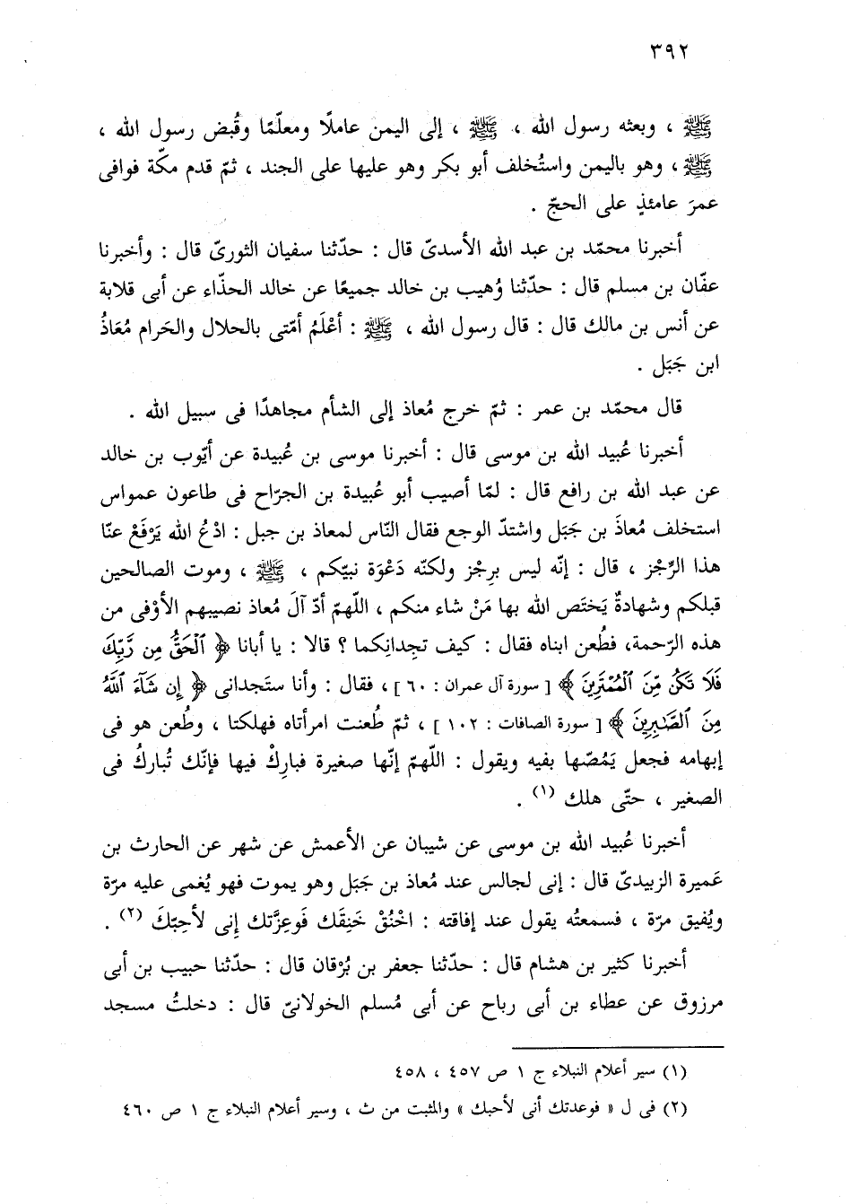 أخبرنا محمّد بن عبد الله الأسديّ قال: حدّثنا سفيان الثوريّ قال: وأخبرنا عفّان بن مسلم قال: حدّثنا وُهيب بن خالد جميعًا عن خالد الحذّاء عن أبى قلابة عن أنس بن مالك قال: قال رسول الله، -صلى الله عليه وسلم-: أعْلَمُ أمّتى بالحلال والحَرام مُعَاذُ بن جَبَل.