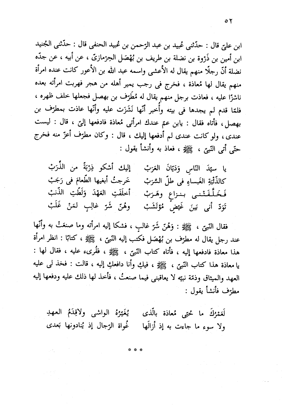 ابن عليّ قال: حدّثنى عُبيد بن عبد الرّحمن بن عُبيد الحنفي قال: حدّثنى الجُنيد ابن أمين بن ذَرْوة بن نضلة بن طريف بن بُهْصَل الحِرْمازيّ، عن أبيه، عن جدّه نضلة أنّ رجلًا منهم يقال له الأعشى واسمه عبد الله بن الأعور كانت عنده امرأة منهم يقال لها مُعاذة، فخرج في رجب يمير أهله من هجر فهربت امرأته بعده ناشزًا عليه، فعاذت برجل منهم يقال له مُطَرّف بن بهصل فجعلها خلف ظهره، فلمّا قدم لم يجدها في بيته وأُخبر أنّها نَشَزَت عليه وأنّها عاذت بمطرّف بن بهصل، فأتاه فقال: يا بن عمّ عندك امرأتى مُعاذة فادفعها إليّ، قال: ليست عندى، ولو كانت عندى لم أدفعها إليك، قال: وكان مطرّف أعزّ منه فخرج حتّى أتى النّبيّ، -صلى الله عليه وسلم-، فعاذ به وأنشأ يقول: