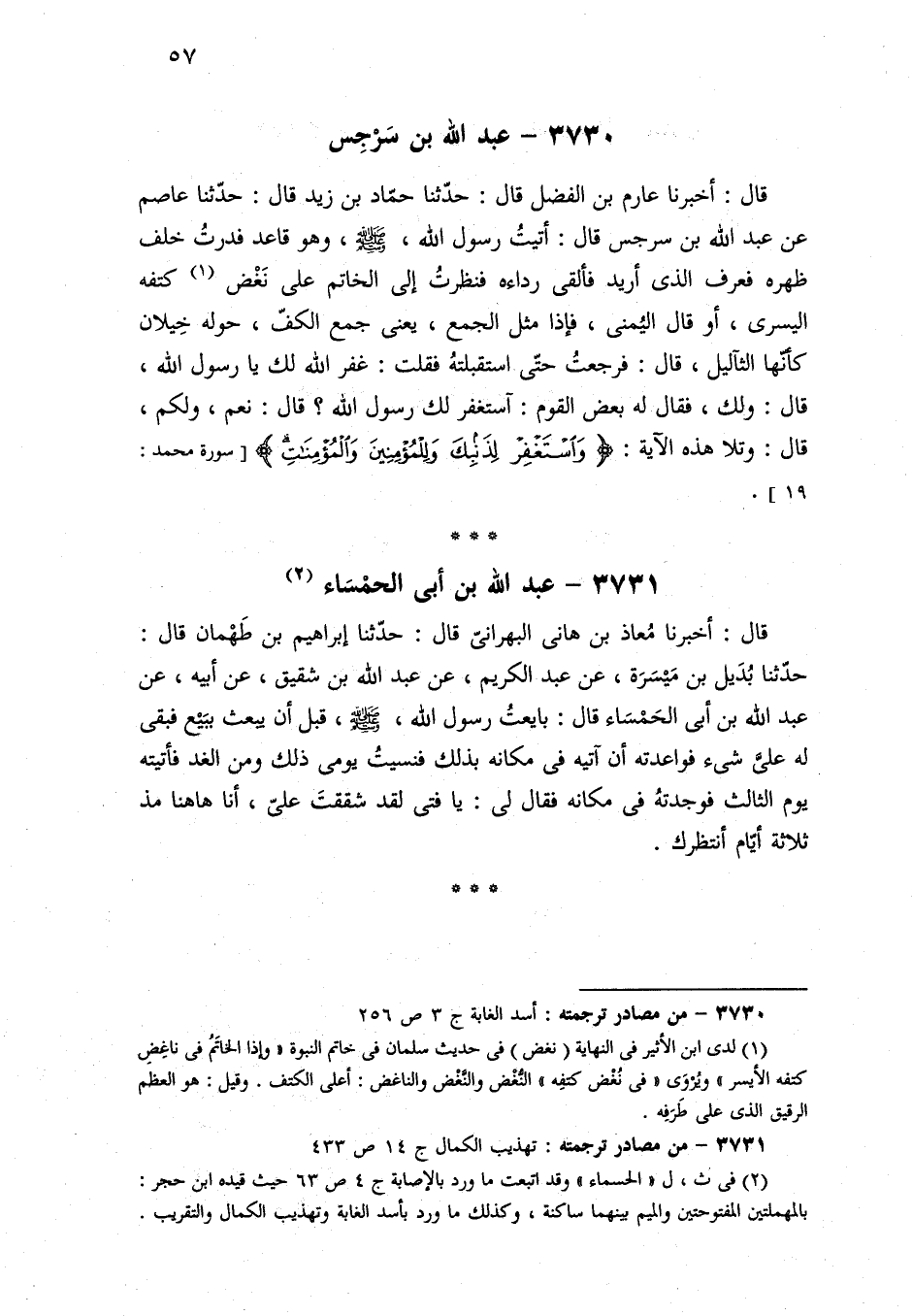 ٣٧٣٠ - من مصادر ترجمته: أسد الغابة ج ٣ ص ٢٥٦.