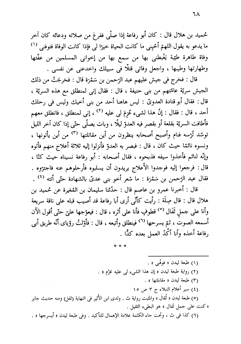حُميد بن هلال قال: كان أبو رفاعة إذا صلّى ففرغ من صلاته ودعائه كان آخر ما يدعو به يقول اللهمّ أحْيِنى ما كانت الحياة خيرًا لى فإذا كانت الوفاة فتوفنى (¬١) وفاة طاهرة طيّبة يَغْبطنى بها من سمع بها من إخوانى المسلمين من عفّتها وطهارتها وطيبها، واجعل وفاتى قتلًا في سبيلك واخدعنى عن نفسى.