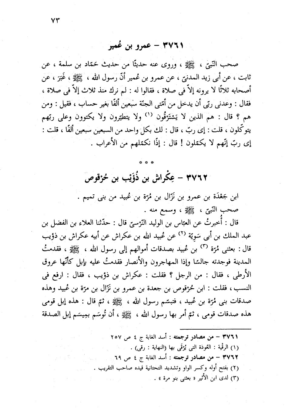 صحب النّبيّ، -صلى الله عليه وسلم-، وروى عنه حديثًا من حديث حَمّاد بن سلمة، عن ثابت، عن أبي زيد المدنيّ، عن عمرو بن عُمير أنّ رسول الله، -صلى الله عليه وسلم-، غَبَرَ، عن أصحابه ثلاثًا لا يرونه إلّا في صلاة، فقالوا له: لم نرك منذ ثلاث إلّا في صلاة، فقال: وعدنى ربِى أن يدخل من أمّتى الجنّة سبعين ألفًا بغير حساب، فقيل: ومن هم؟ قال: هم الذين لا يَسْتَرْقُون (¬١) ولا يتطيّرون ولا يكتوون وعلى ربّهم يتوكّلون، قلت: إى ربّ، قال: لك بكل واحد من السبعين سبعين ألفًا، قلت: إى ربّ إنّهم لا يكمّلون! قال: إذًا نكمّلهم من الأعراب.